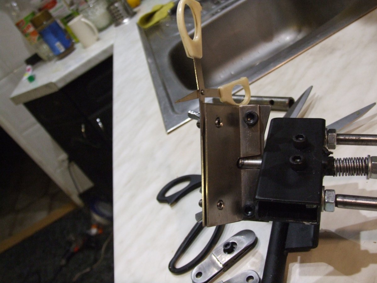 Пластина -уголок под углом 60 град. устанавливается вместо щечек, ножницы прижимаются прижимной пластиной.