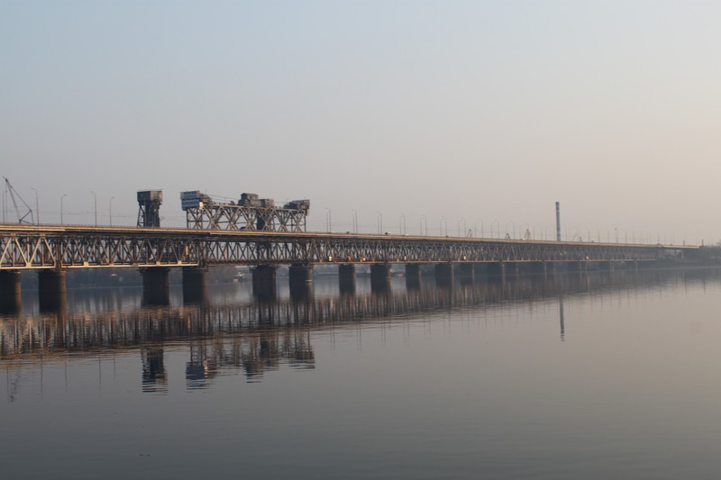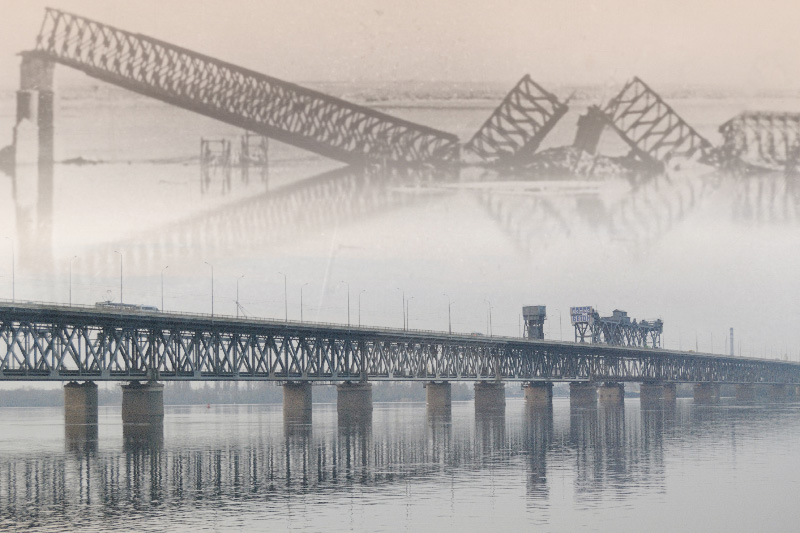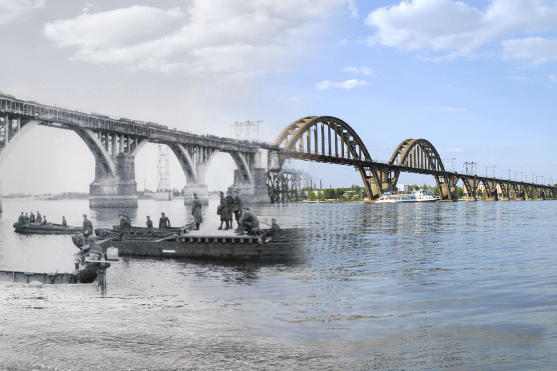 Оба моста сейчас существуют. Первый называется Старый (или Амурский) - двухярусный, второй - железнодорожный Мерефо-Херсонский мост. Последний проходит через остров, поэтому и возникает вопрос о слишком узком Днепре. В 1941г. были восстановлены оба моста - второй назывался именем Клейста (на фото видно остров).