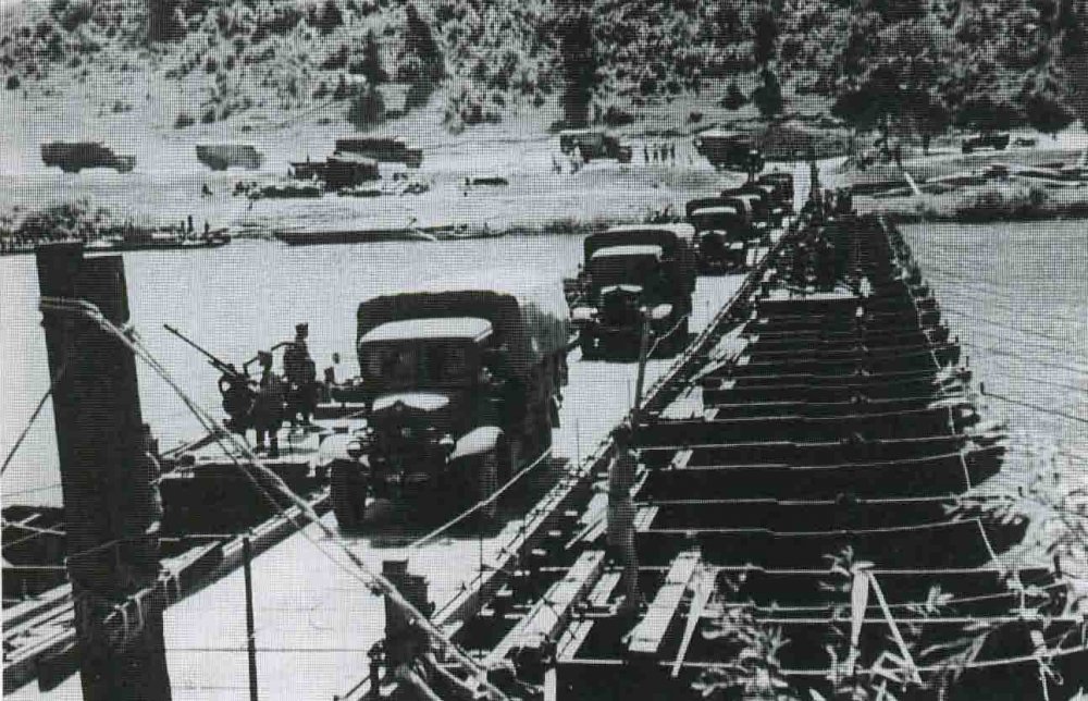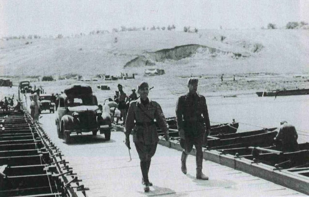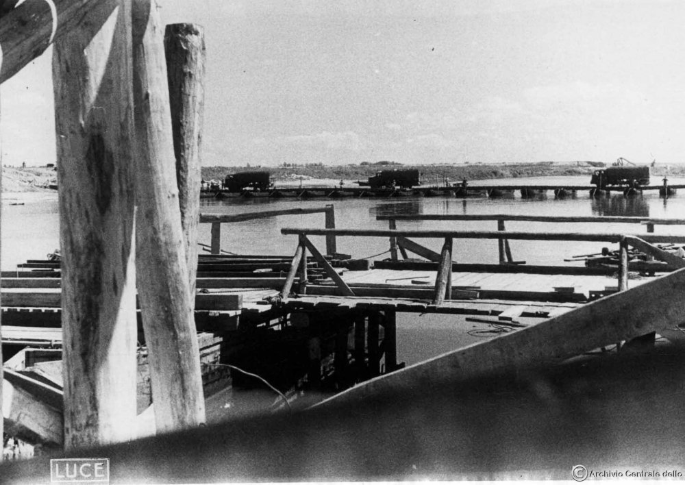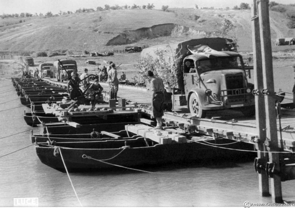 Позже, в начале августа, между двумя мостами 21-я рота построила деревянный мост на сваях с характеристиками: длина 135 м. , ширина 3,5м., грузоподъемность 25т. Время строительства 40 дней. Этот мост назвали « Ponte Gen. Gariboldi ».имени генерала Итало Гарибольди – командующего 8-ой армией. Что интересно, этого моста почти нет на фотографиях с техникой, нет и такой фотографии, чтобы было видно в работе все три моста вместе. Есть только схема мостов выполненная итальянскими понтонёрами. О ней ниже. Вот фото, которое можно точно датировать, что это первые числа августа 1942 года. Здесь мы видим движение по мосту №1, а за мостом начинается строиться свайный мост им генерала Итало Гарибольди.