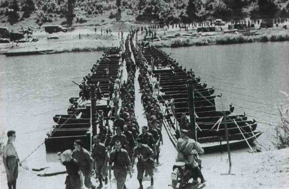 Тут в кадр попали конструкции строящегося свайного моста Итало Гарибольди, чуть дальше понтонный мост №1 и еще дальше виднеется взорванный автомобильный мост. На приведенной в посте #217 схеме попытался определить место и ракурс съемки.