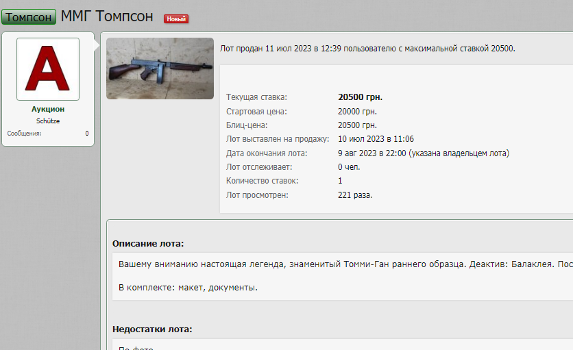 Если Вы сравниваете с одной единственной продажей - то средневзвешенная цена с 2020 до 2023 года выросла с 10-12 тыс. до 28. Возьмем привязку (которая не работает линейно и к ней стоит относится очень дифференцировано) курсу 28 грн за у.е. Цена на ММГ будет 360-430 у.е. Но если сравнивать с средними ценами даже этого года в 16-20 тыс. (продажу по 28 я не вижу причин считать репрезентабельной в силу выпадания ее из общей картины - флуктуацией рынка) при цене в 40 грн за у.е. то получаем 400-500 у.е. Если считать в гривне - рост на 80% - даже не в два раза. Если в долларе - от 12 до 17% (что для гривневой составляющей совсем грустно) - где эти 2,5-3 раза роста - непонятно. Как писал выше - оценивать стоимость по одной единственной продаже, не смотря на остальные - неверно в корне. С учетом катастрофического падения спроса, среднего падения предложения, реальной покупательской способности - вероятность продажи низка. Безусловно найти запчасти на Томми крайне сложно. Но, тут это работает и в другую сторону - наличных предложений СХП ППТ за последние годы не было и вряд ли будет. Но с учетом сложности с патронами к нему - спрос еще меньше. Применять его где-то, кроме рекона и непонятного вида съемок - вообще вопрос крайне сомнительного будущего (возможно кроме реконструкции "политически верного" боя под Крутами, у нас появится более развитый рекон бритов и амеров (битву за Булге будем в "правильных" декорациях проводить - с адреналином в виде неразорвавшихся снарядов и противопехотных мин) - но с учетом уровня вхождения в эту ветку и стоимости снаряжения - почти неподъемный вариант для среднестатистического реконструктора). Потому тут прогнозировать сложно, но цена СХП в данном случае по моему мнению больше в среднем на 30-50%, а с учетом определенной эксклюзивности и редкости товара - 1000 у.е. не видится таким уж совсем несбыточным. но скорее всего в среднем 700, максимум 800. Товар на штучного клиента. Вопрос в том как показать товар и доказать безотказность работы.