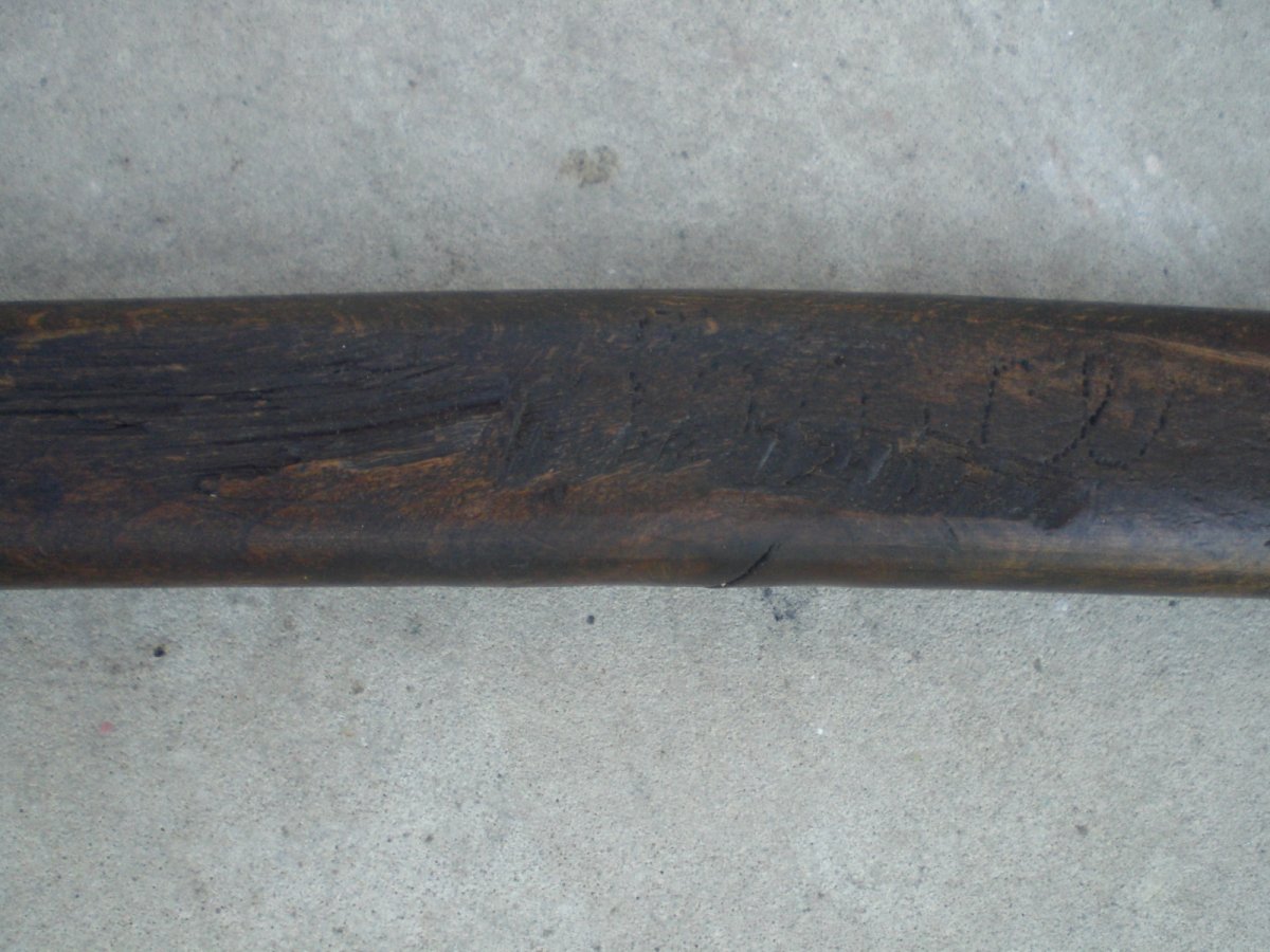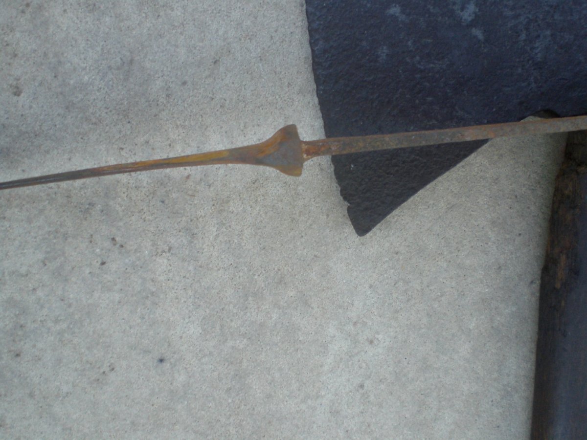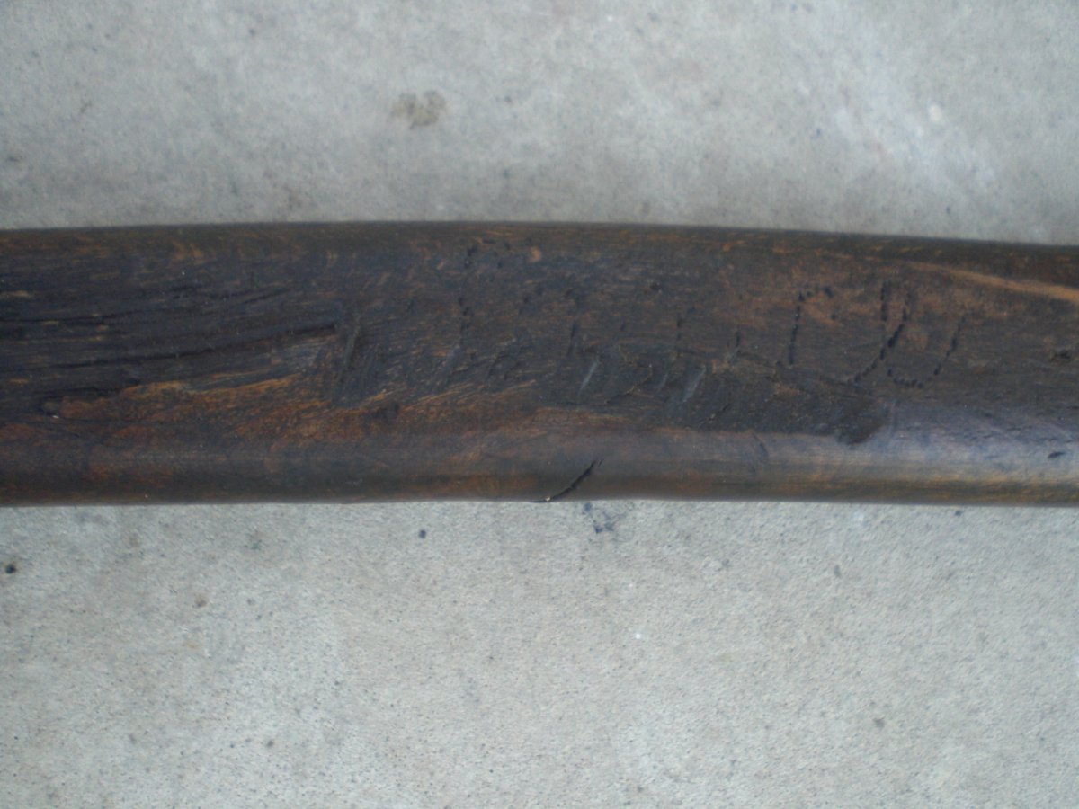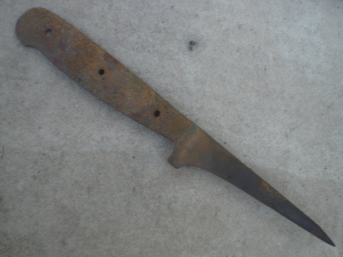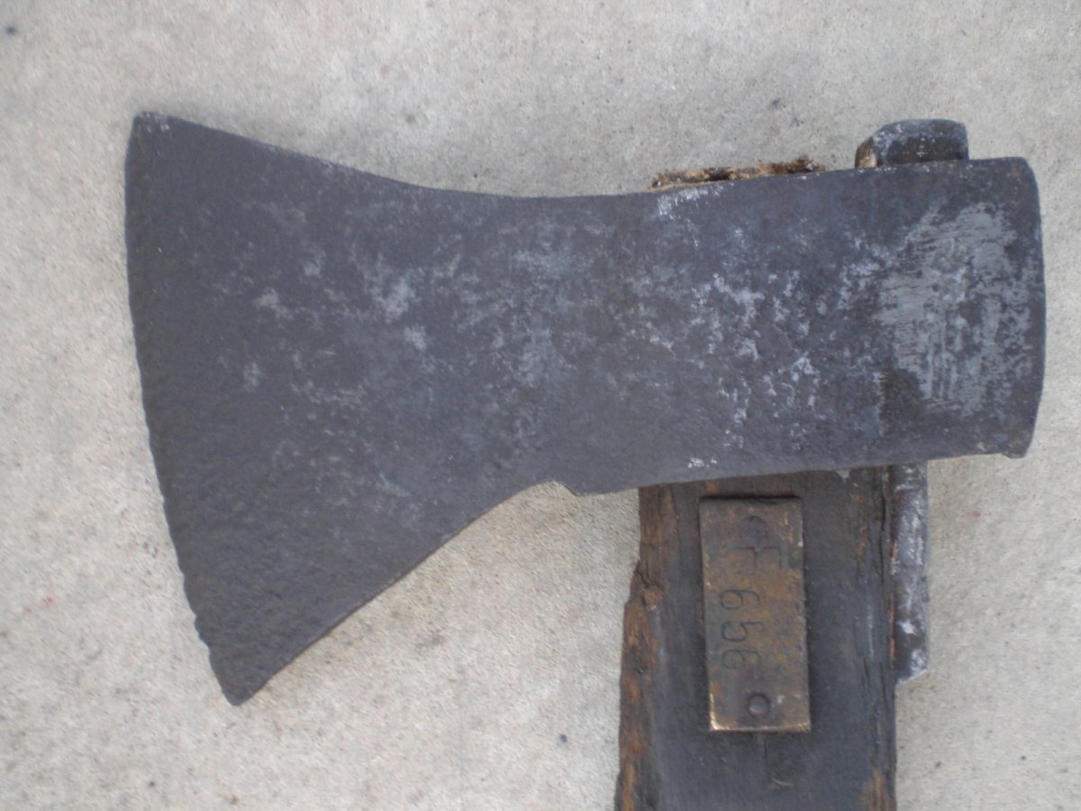 Доброго.Купил себе вот такой топорик. Заинтересовала инвентарная бирка на топорище, что соответствует номере на топоре. И топорище по ходу родное. Чуть трухлявое, но еще можно поработать. Помогите с клеймом. Пересмотрел весь русско-язычный топорный сайт. Не нашел. Ивот такая сарайная находка в виде заточки. Рукоятка вроде напоминает немецкие ножи, там их множество разновидностей. Но сдается мне, что нож мясокомбинатовский времен СССР. Помнится с такими на бураки ездили. Толщина ручки 3 мм. Может кто прокомментирует.? С Ув.