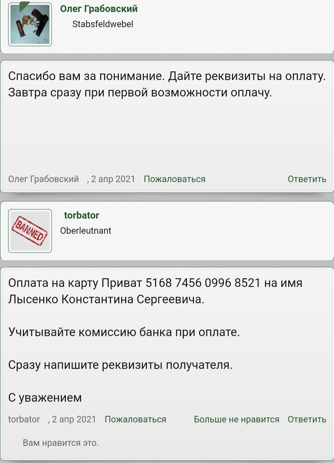 Я покупал у обоих (до войны). Реквизиты предоставлялись одинаковые. Говорил торбатор мне что это его родственник (толи сын, толи меньший брат, уже не помню) но курировал он оба акка. Платил я по крайней мере при покупке на карту торбатора...Когда торбатор был в кратком бане то за мего мазу тянул именно этот акк..