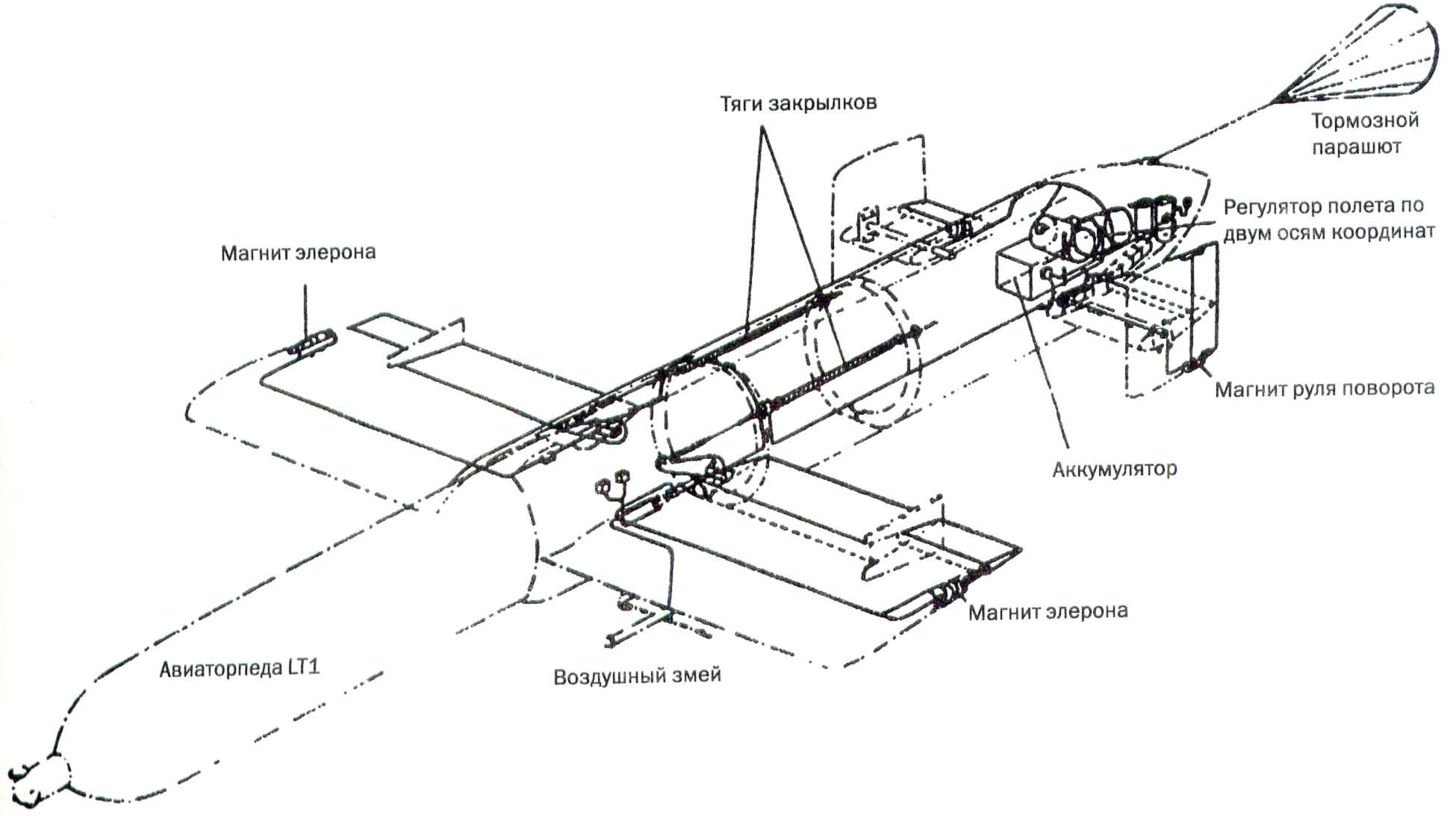 LT.1500 Торпеда LT.1500 разработки LFA оснащалась ракетным двигателем HWK и CPVA (Химико – физический институт). Система управления разрабатывалась фирмой TH (Axan). LT.1500 Длина – 7.05 м, максимальный диаметр – 0,533, вес - 1520 кг, вес топлива - 448 кг, (Ts.Stoff – 379 кг, Dekalin – 45 кг и Z.Stoff -24 кг), вес боезаряда – 682 кг. NVK В августе 1943 г. фирмами AEG и Atlas была разработана дистанционно управляемая авиационная торпеда NVK. Испытания торпеды проводились в TVA (Готенхафен) под руководством доктора Aschoff, управление торпеды осуществлялось по проводам. По результатам испытаний торпеда была рекомендована в производство, однако специалисты RLV посчитали, что она будет сложна и ненадёжна в эксплуатации, поэтому от дальнейших работ отказались.