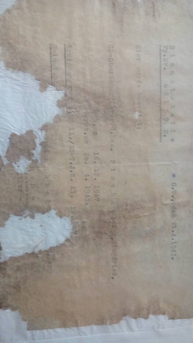 Це папірець з особистими даними, аналог ЛОЗа, який закладався в пляшці в могилу для ідентифікації у випадку відсутності в убитиго жетону або просто для підстраховки. обершаршюрер запасу військ СС Зігфрід Пішкелле (1907 - 20.4.1943) Жетон: 11./SS-T.J.R 11 - 11 полк СС "Мертва голова". Судячи з усього, служив в 13 поліцейському полку СС.