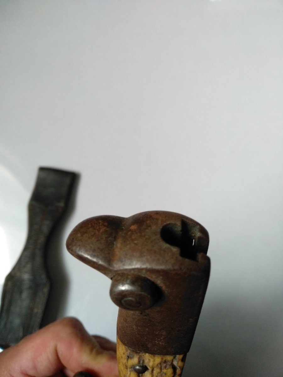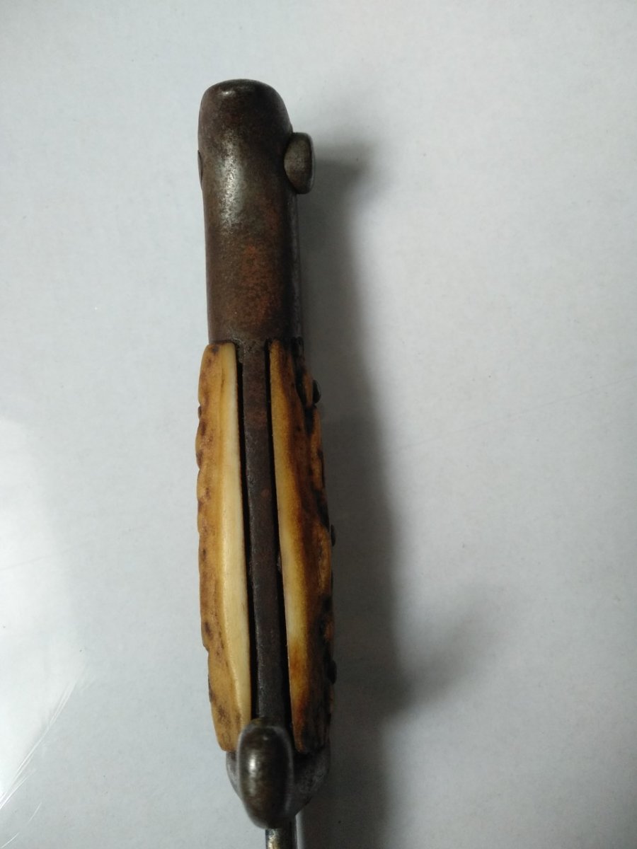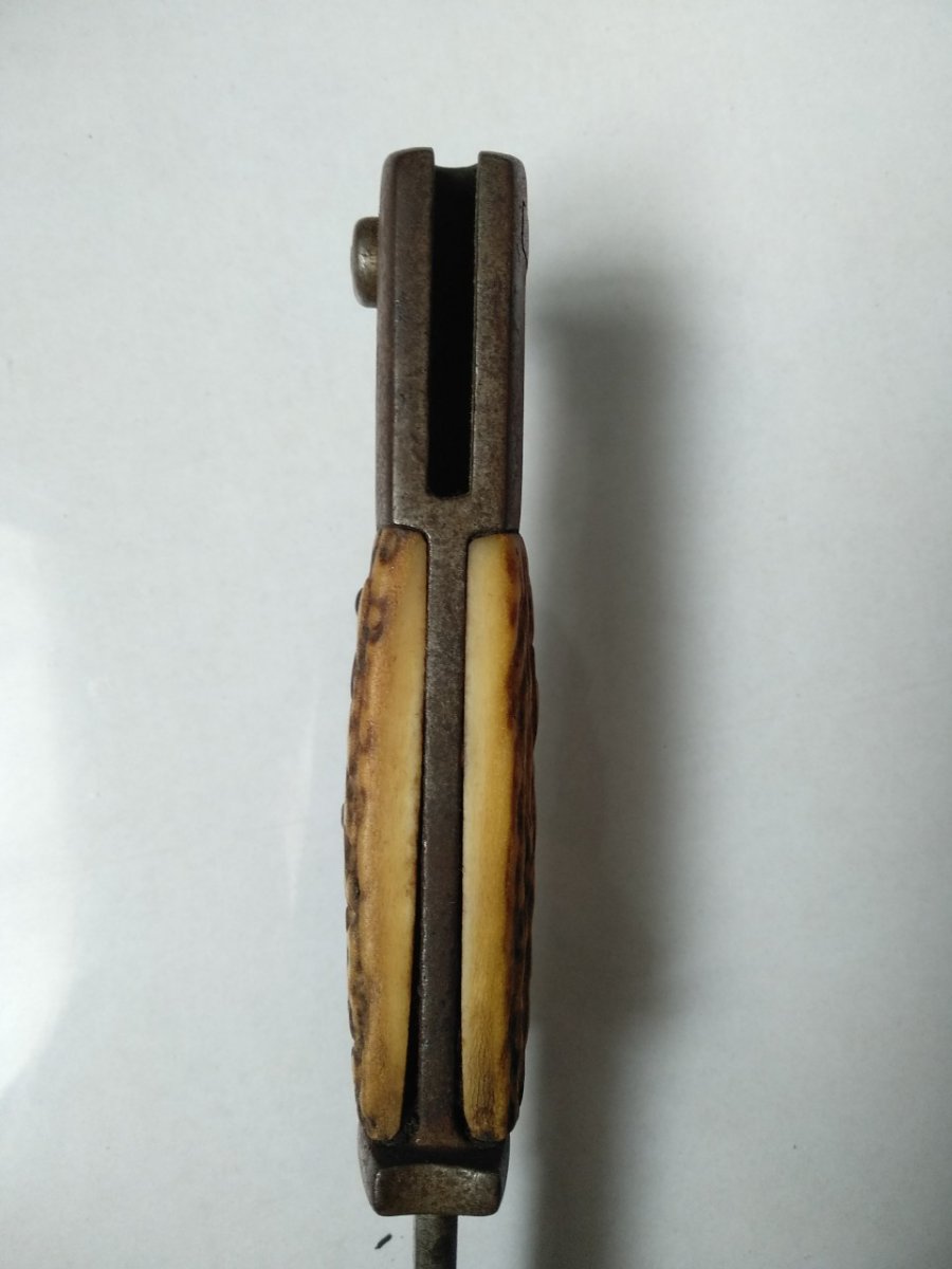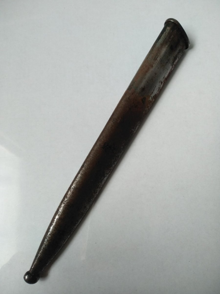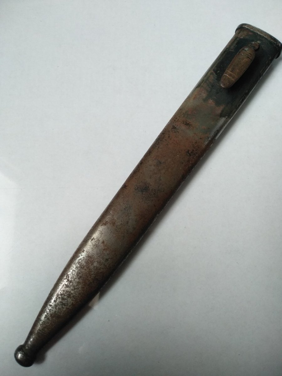 Привітався, - тож з'ясовується, шо не траншейник, а байонет і не звичайний. Не часто можна побачити байонет WKC з роговими накладками на три закльопки, та з клином "акулій зуб" схоже на то. Також підвіс цікавий, - схоже офіцер по парадах таскав цей "ніж" яка довжина і товщина клина?