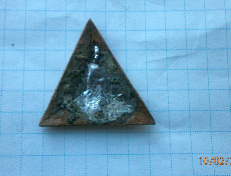 Приветствую. нашелся вот такой треугольничек -латунь с обратной стороны было паяно оловом проволочка отпала. В петличку ? и что за звание и на какие года? Всем Спасибо