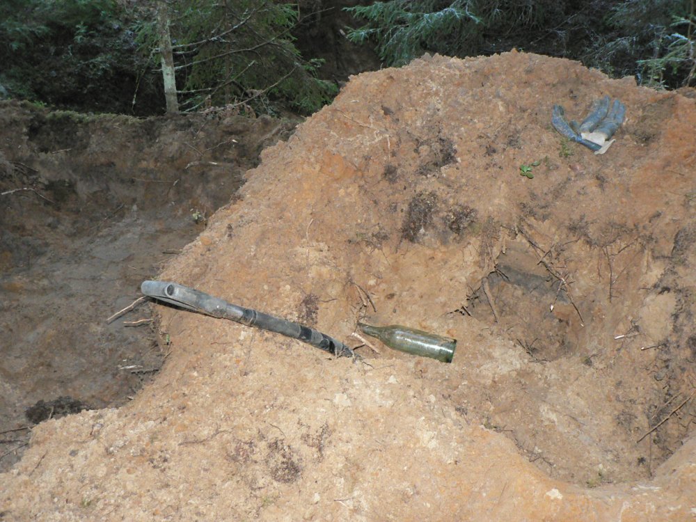 Места интересные, хоть и выбитые нашим братом довольно тщательно. Уже начало смеркаться, когда набрели на пару нетронутых блинов. В бруствере помойка. Начал шурфить, посыпался пищевой хабар... Но копать было уже некогда, так как до машины топать около часа, да еще и рухнувший мост (если его можно так назвать) нужно было форсировать, а темнело на глазах. В общем поставил засечку на навигаторе и отправились в обратный путь. И вот беда, моя машина в ремонте, друг ушел в смену, а у меня душа не на месте. Место добивать надо, а добраться не на чем.