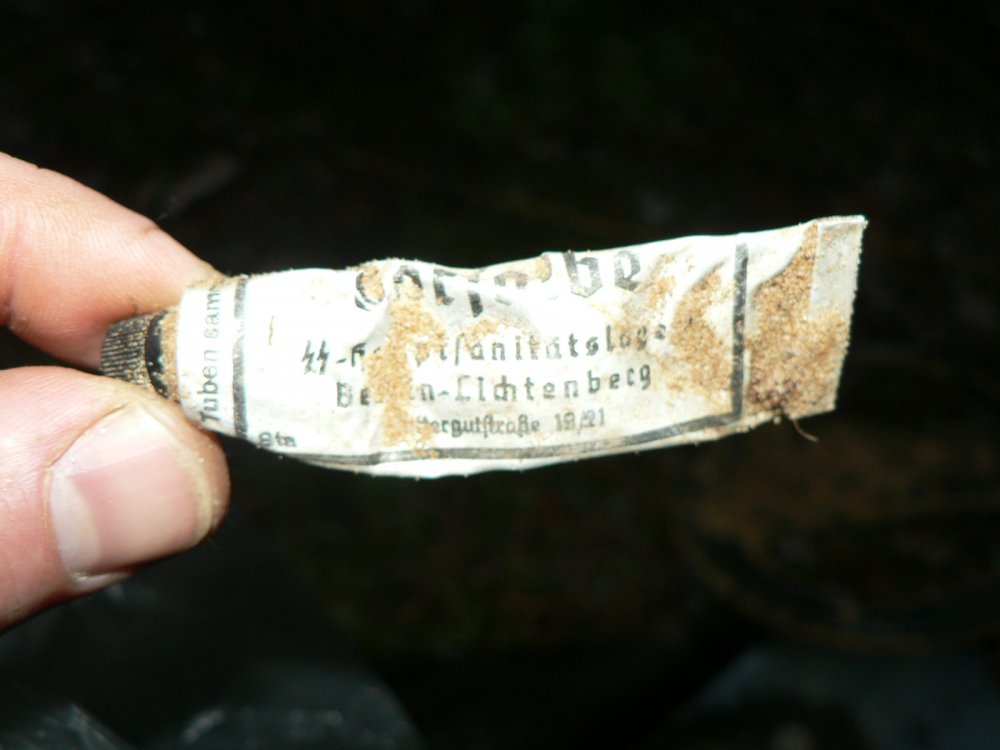 Вот что я смог себе выбрать в качестве трофеев из кучи хрени. Попался интересный тюбик с рунами ЦЦ (вроде мазь от обморажения) Ну и 10 фенингов... Короче вроде и не зря съездил, но находок как то слабовато. Начал забивать шурфы в блиндаже, вроде не пустой. Толком не разведал, так как день короткий, времени мало... И еще вопрос. Рядом на горе нашел поляну на которой штук двадцать прямоугольных неглубоких ям (точно не блиндажи), размером примерно 2,5х2,5 метра. Что это может быть? У меня мысли только - минаметные расчеты.