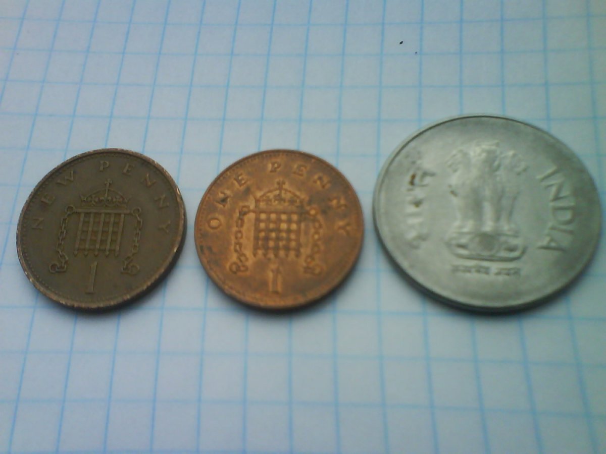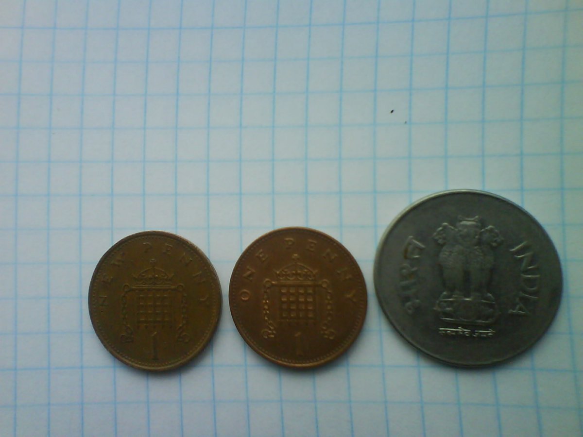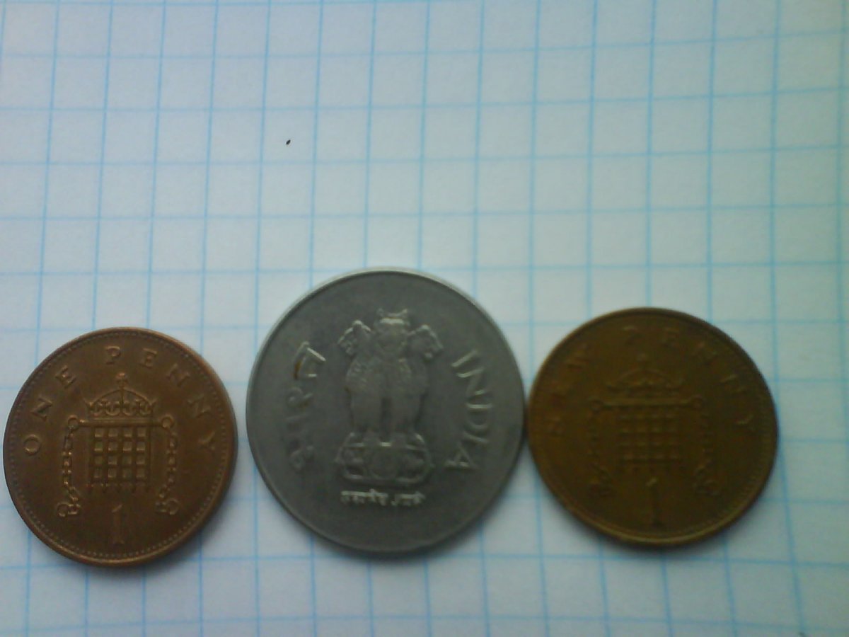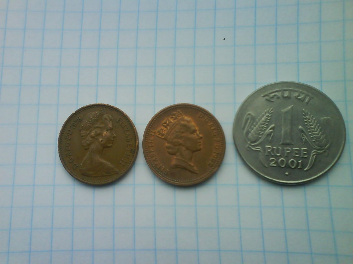 Монета в 1 рупий из Индии, на 2-х других королева Великобритании Елизавета II. Монеты английские, номиналом в 1 пенни.