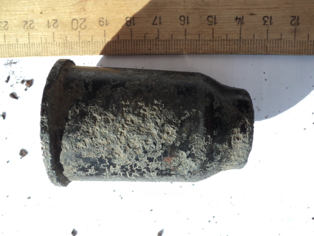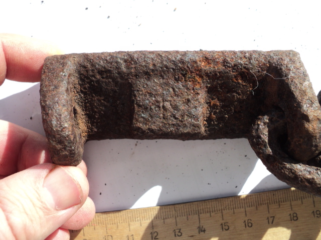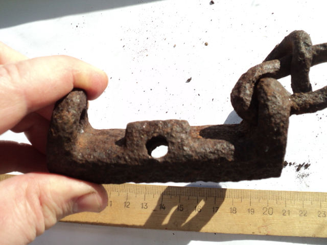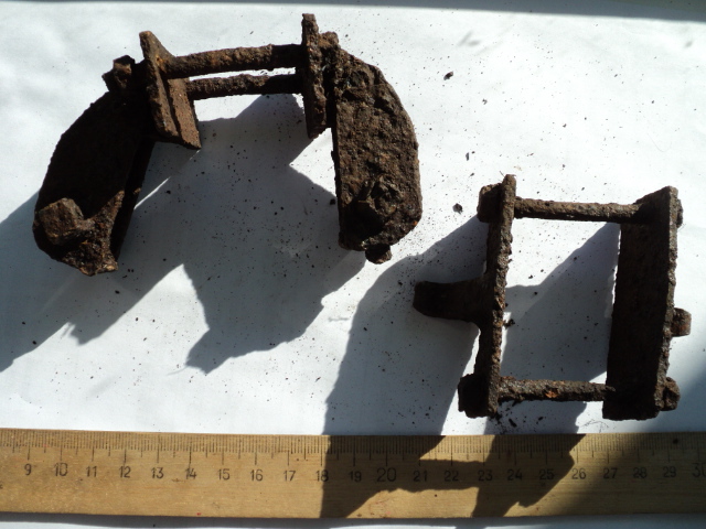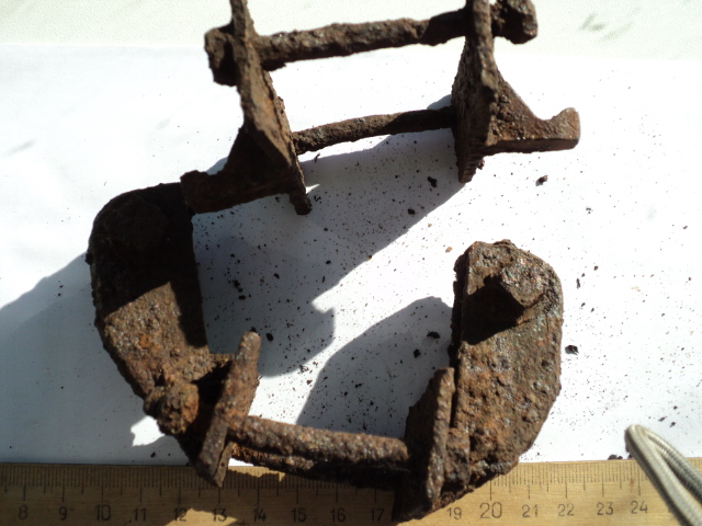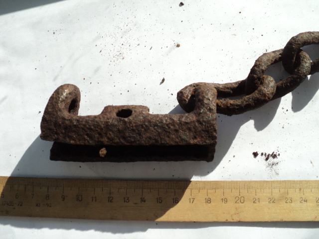 Нарылись такие непонятки на немецких позициях. Деталь с цепью явно на что-то одевалась и фиксировалась. Вроде как буква R просматривается. Цинковый то ли стакан, то ли колпак (в той же ямке были немецкая мыльница, закрутка от колотухи и мосинская гильза). И какое-то приспособление из двух деталей. Они были сцеплены между собой.