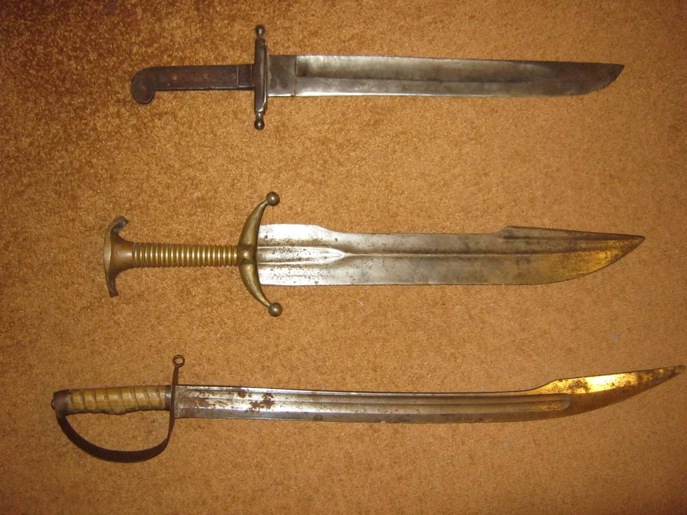 Держал в руках эти сабли. Две нижние - какого-то пиратского вида, видно , что долы и спуски серьёзной формы и не на коленке в гараже сделаны... А вот форм таких никогда не видел...