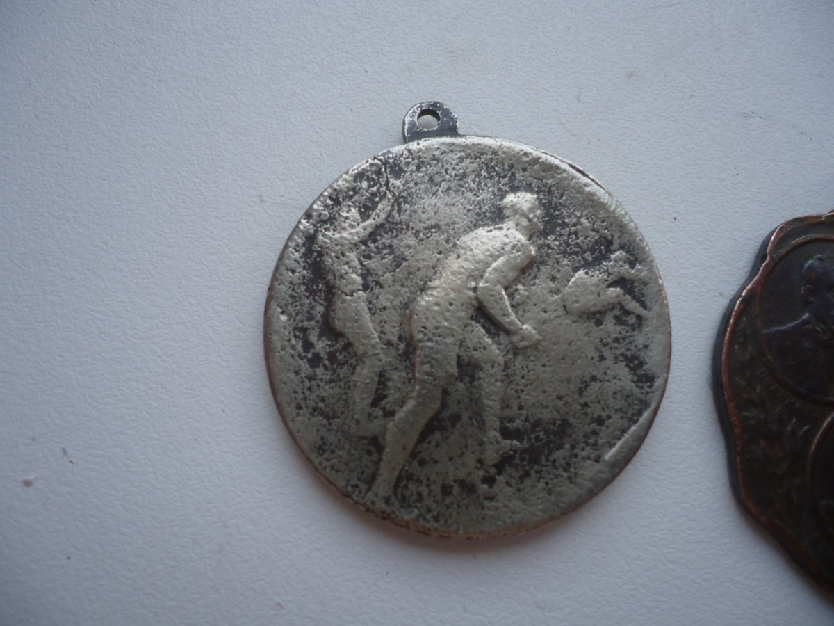 По первой медали мне удалось найти что она как-то связана с Ужгородской атлетической гимназией. Ну то что за прыжки в длину - и "ежу понятно". Вот ссылка по ней видно аналогичную медаль https://yandex.ru/images/search?text=Прыжок в длину Медаль Ужгородской атлетической гимназии&stype=image&lr=213&noreask=1&source=wiz