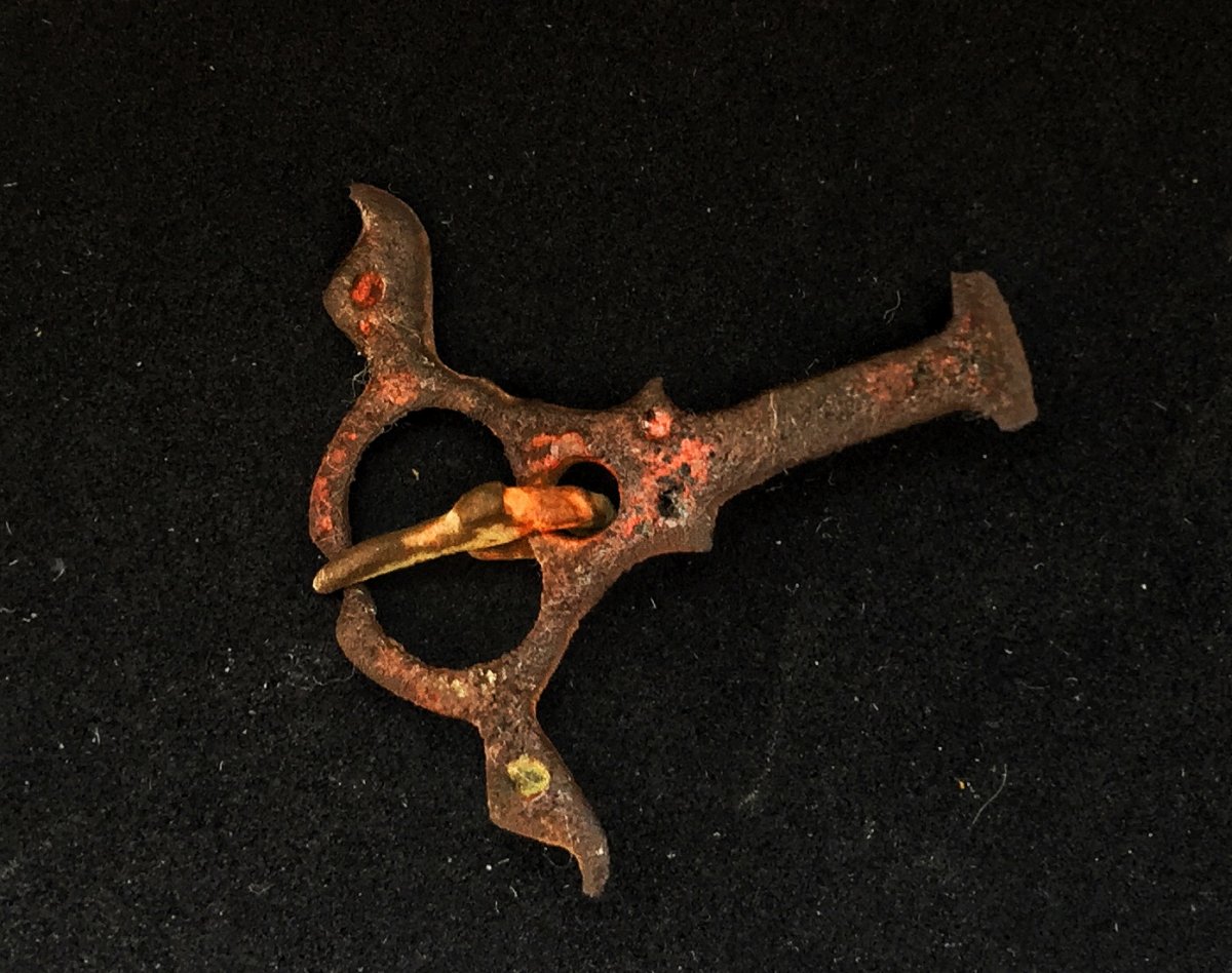 Над браслетами,но с самого верха лежала пряжка. Думал просто совпадение, выглядела она как медная. Но после расчистки проявились следы эмалей. Может быть она того же периода что и браслеты?