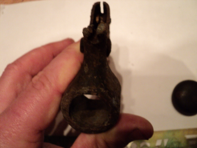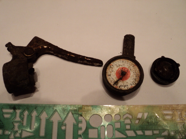 Вот такие штуки вырыли сегодня. Первая скорее всего ручка от мототехники. У самого в детстве мопед был. Только почему-то очень маленькая. Вторая - для измерения давления в шинах, а третья какая-то крышка. Может уточнит кто.