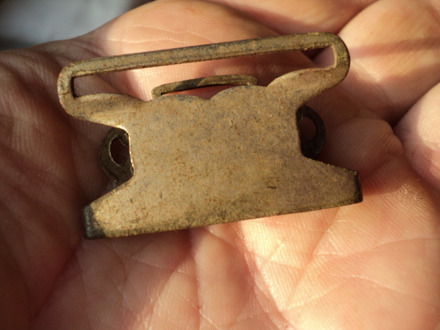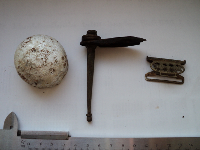 Первая какой-то алюминиевый колпачок с гербом (лиса на щите сидит).Надпись что-то про помаду: над гербом HUXOLIN POMADE. Под гербом F.WOLF & SOHN KARLSRUHE BADEN. Интересно от чего. Вторая непонятка с надписью Petroleum. Может от канистры какой? Третья непонятная изящная пряжечка, найдена в поле. На не ней надпись DEPONIRT 1882. Интересно это год основания фирмы или изготовления пряжки. Материал медь с покрытием белям металлом.