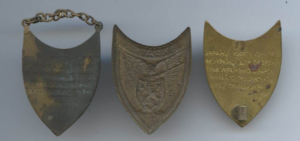 1 знак - "Соборна Україна 1917", знак в честь провозглашения Универсала в Украине 1917. https://forums-su.com/viewtopic.php?t=668466 https://ru.wikipedia.org/wiki/Универсалы_Центральной_рады 2 знак - Общества Красного Креста УССР