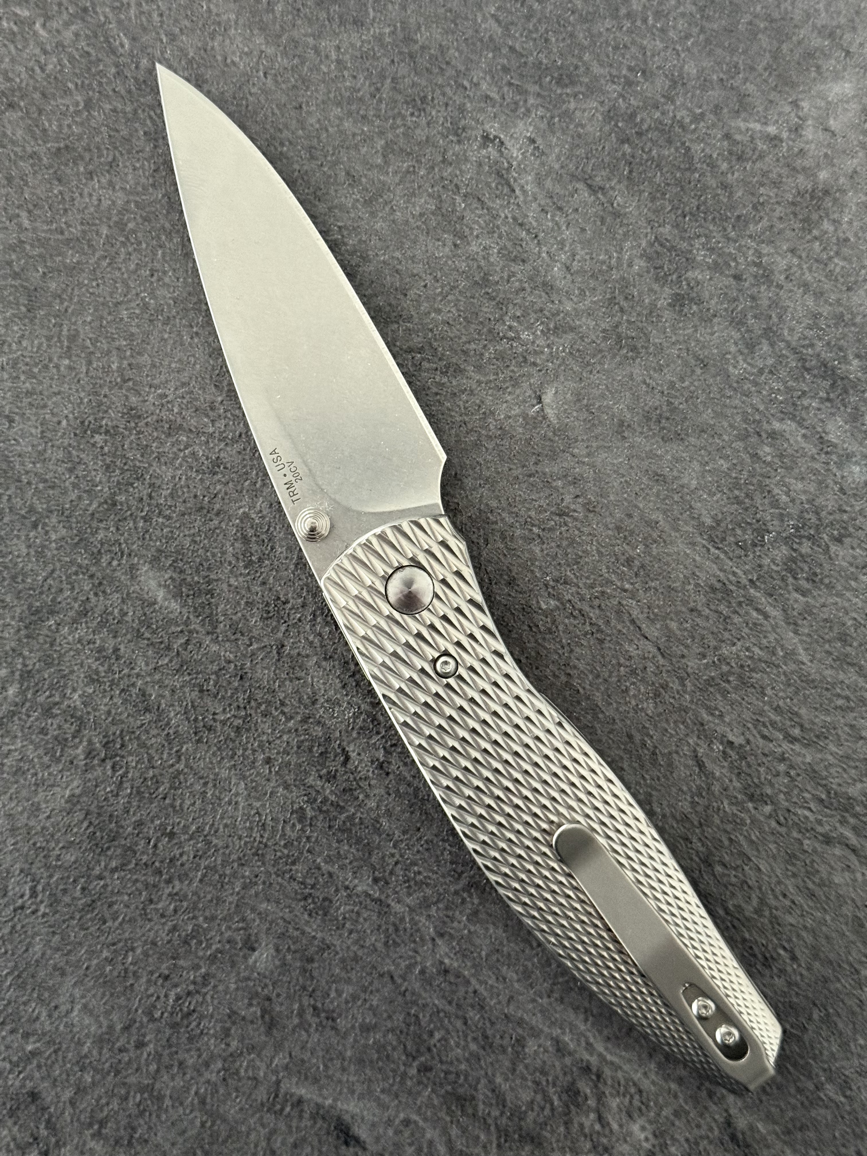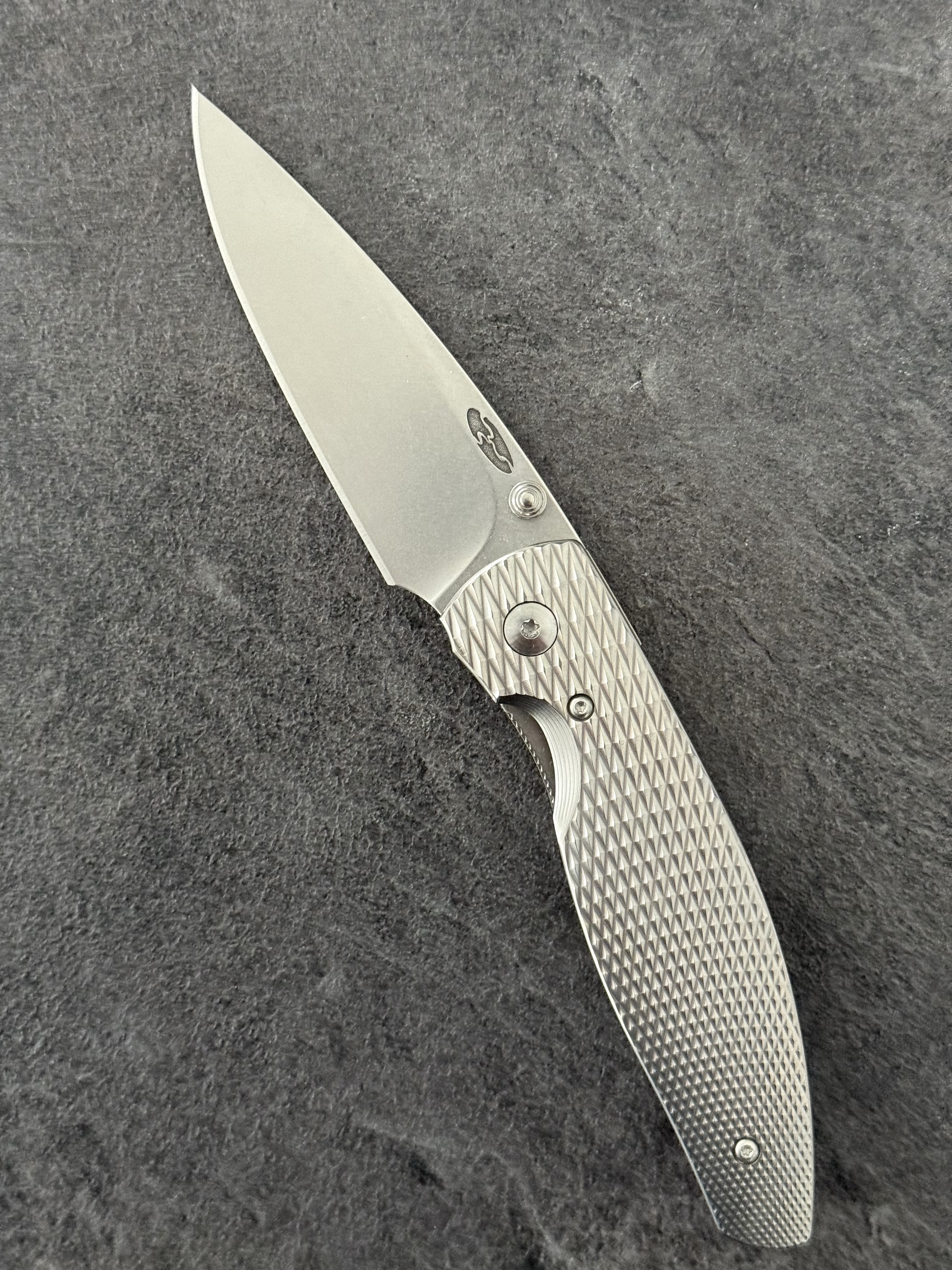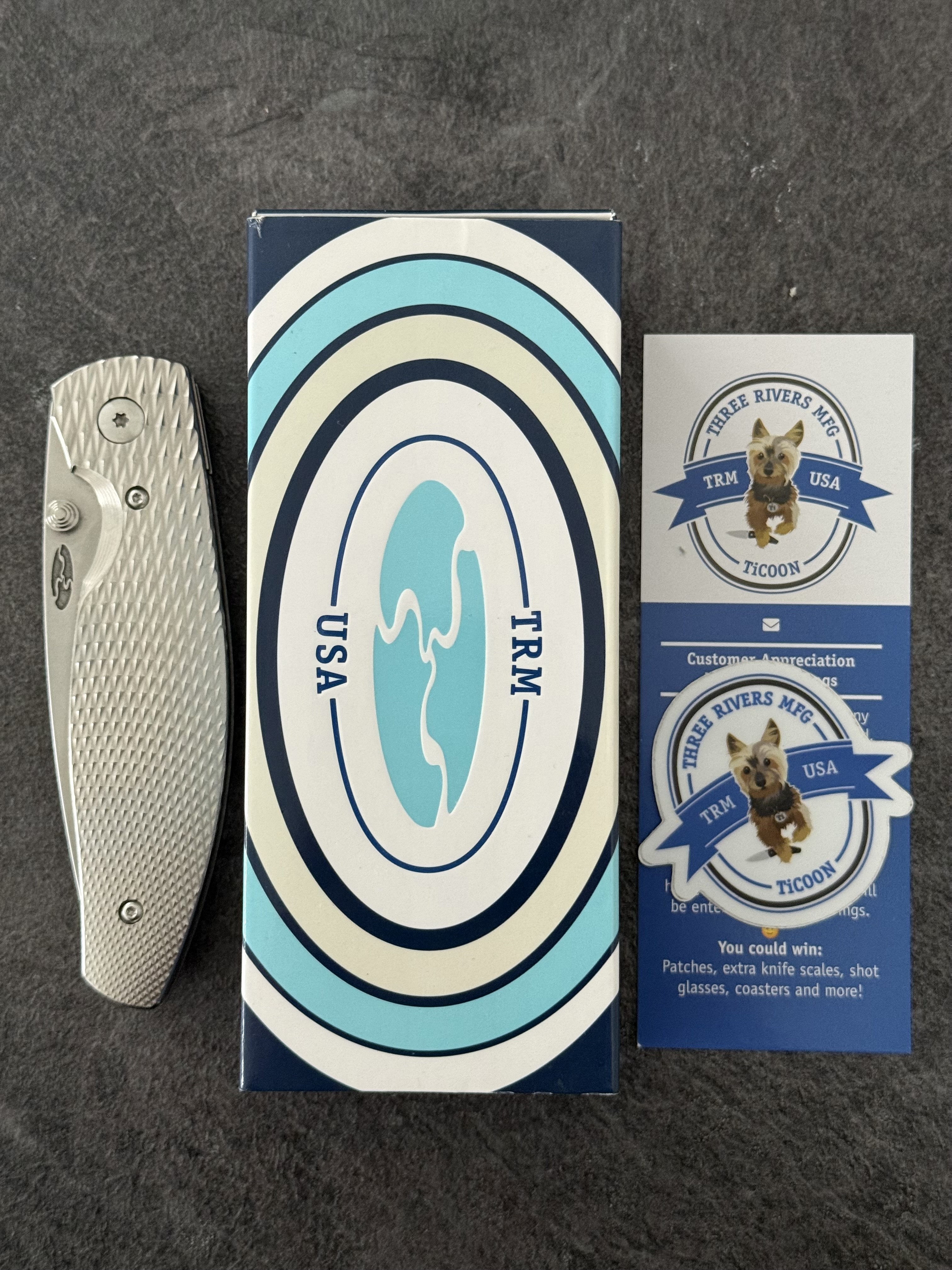 TRM Atom LIZARD SKIN Texture Технічні характеристики: Довжина у відкритому вигляді: 21,7 см Довжина у складеному вигляді: 11,7 см Сталь: CPM 20CV Довжина клинка: 8.9 см Товщина клинка: 0.23 см Шайби: Фосфорна бронза Тип замка: Linerlock Матеріал ручки: Титан Lizard Skin 3D-Contoured Виготовлено в США Комплектація: повна Стан: б/в наближений до ідеального Ціна:$370