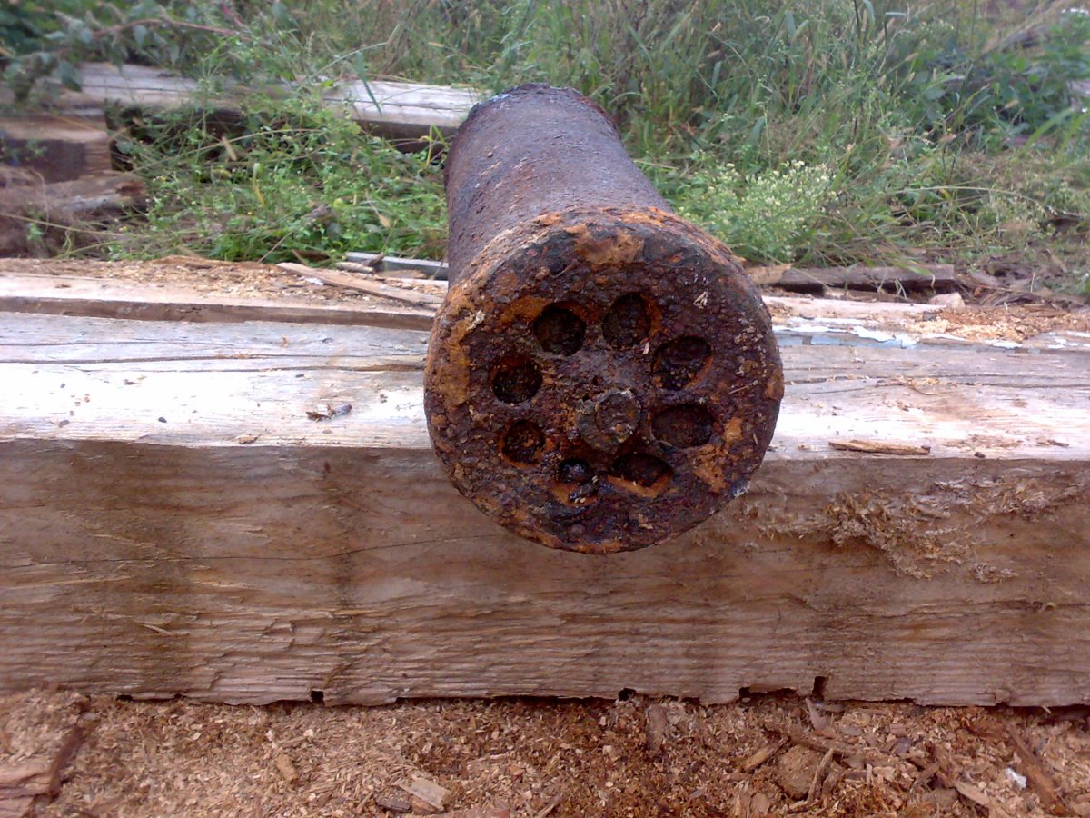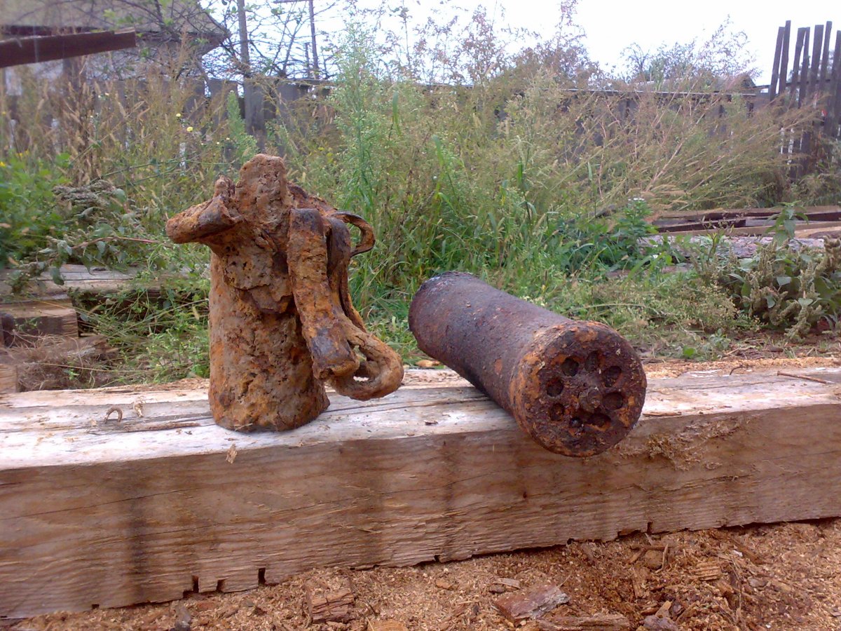 Здраствуйте! Нашел глубинником две трубы. одна порвана на загнутые ленты а вторая относительно целая. Найдены в разных местах но недалеко друг от друга. Внутренний диаметр 120мм, длина примерно 400мм. На конце трубы мелкая резьба. Вместе с трубой в яме были небольшие пружины с зацепами. Может это останки миномета?