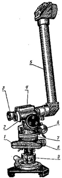Точно! Спасибо большое! Буссоль ПАБ-2АМ, правильно я понимаю? Схема 104. Буссоль 1 - ориентир-буссоль, 2 - привод механизма вертикальной наводки; 3 - окуляр; 4 - оптический визир, 5 - зеркальный перископ, 6 - привод механизма горизонтальной наводки; 7 - шкала; 8 - ориентирующий червяк, 9 - шаровая пята Схема отсюда