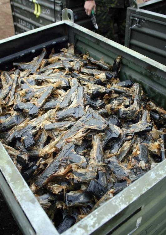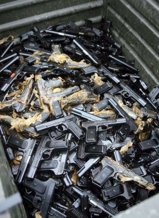 У меня дядька присутствовал на таком мероприятии в 45м или 46м годах. Но там кузнец на наковальне бил по разу на пистолет кувалдой. Один он домой все таки утащил ( по рассказу размер или браунинга или ппк).