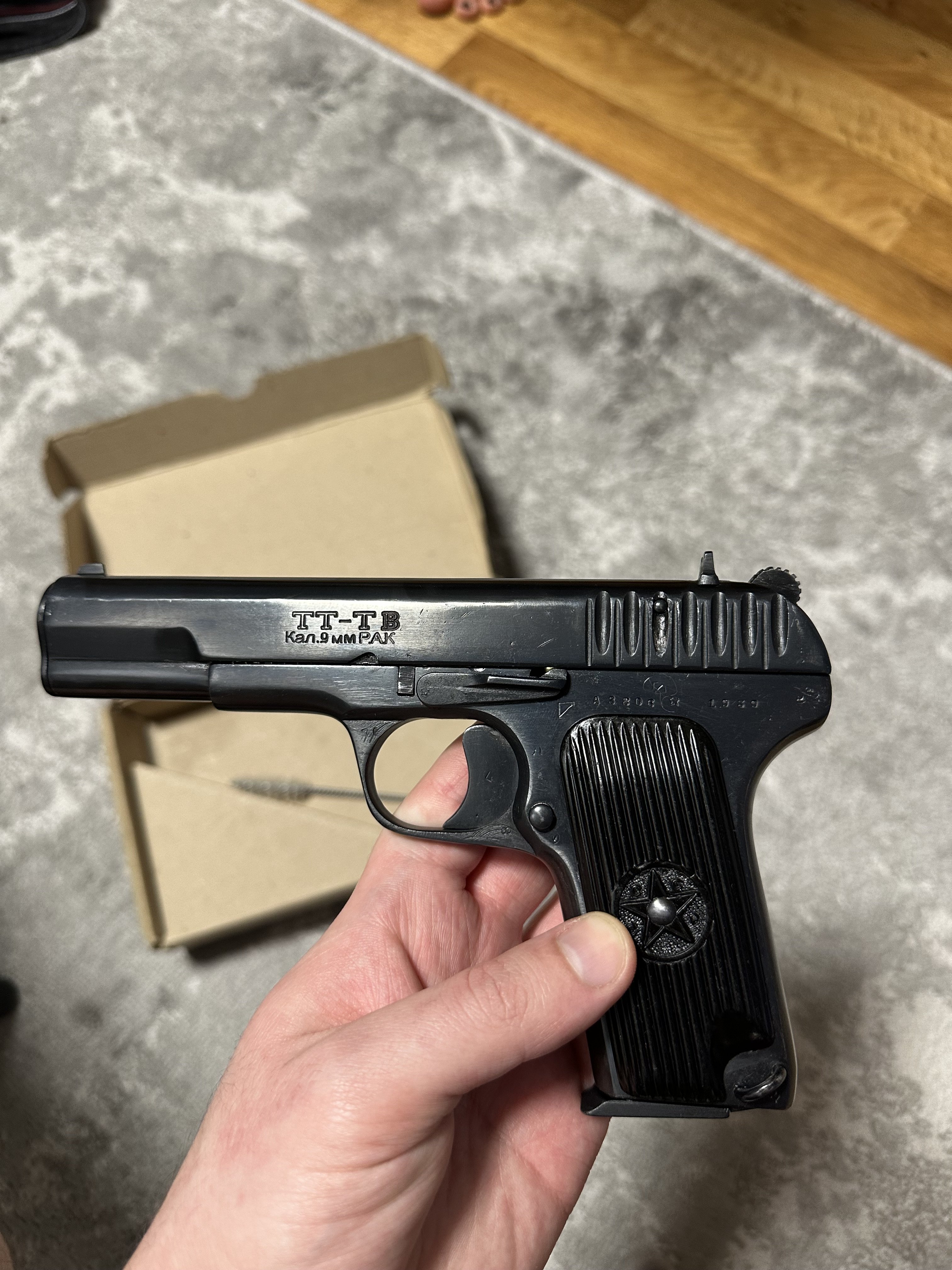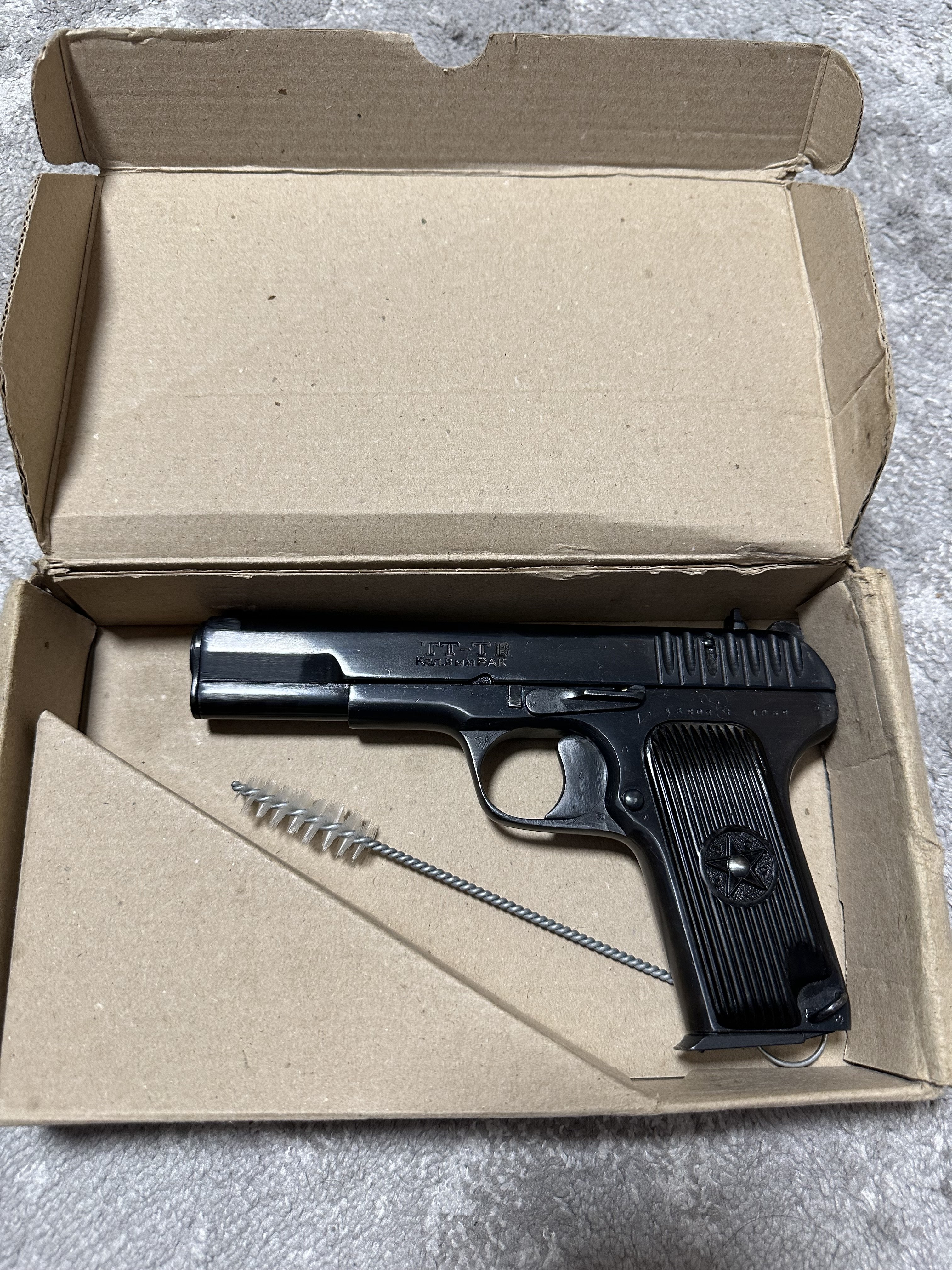 Всім бажаю міцного здоровʼя! Прошу дати орієнтовну оцінку ТТ-ТВ «Ерма-Інтер». Виріб в гарному стані, настріл 50 шт, працює без нарікань на турецьких та наших холостих 9 мм набоях. В комплекті виріб ТТ-ТВ, заводський паспорт, коробка та прилад для чистки. Ніяких змін не вносилось, деактив заводський (втулка в стволі). Всім дякую.