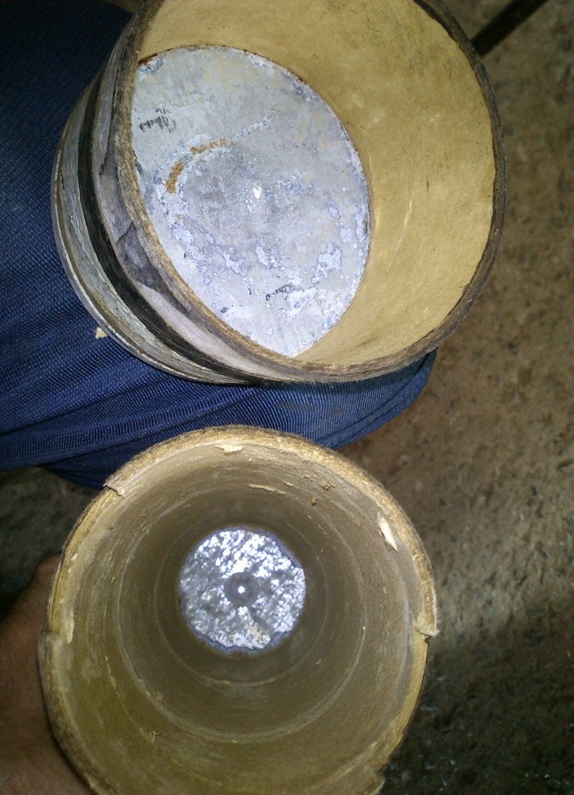 Доброго дня.Вот такой тубус или ёмкость нашёл сегодня.Верх и низ из металла,сама колба бумажная.Длина её 38см.Чёрная полоса на этом тубусе вроде смола Что это или от чего?
