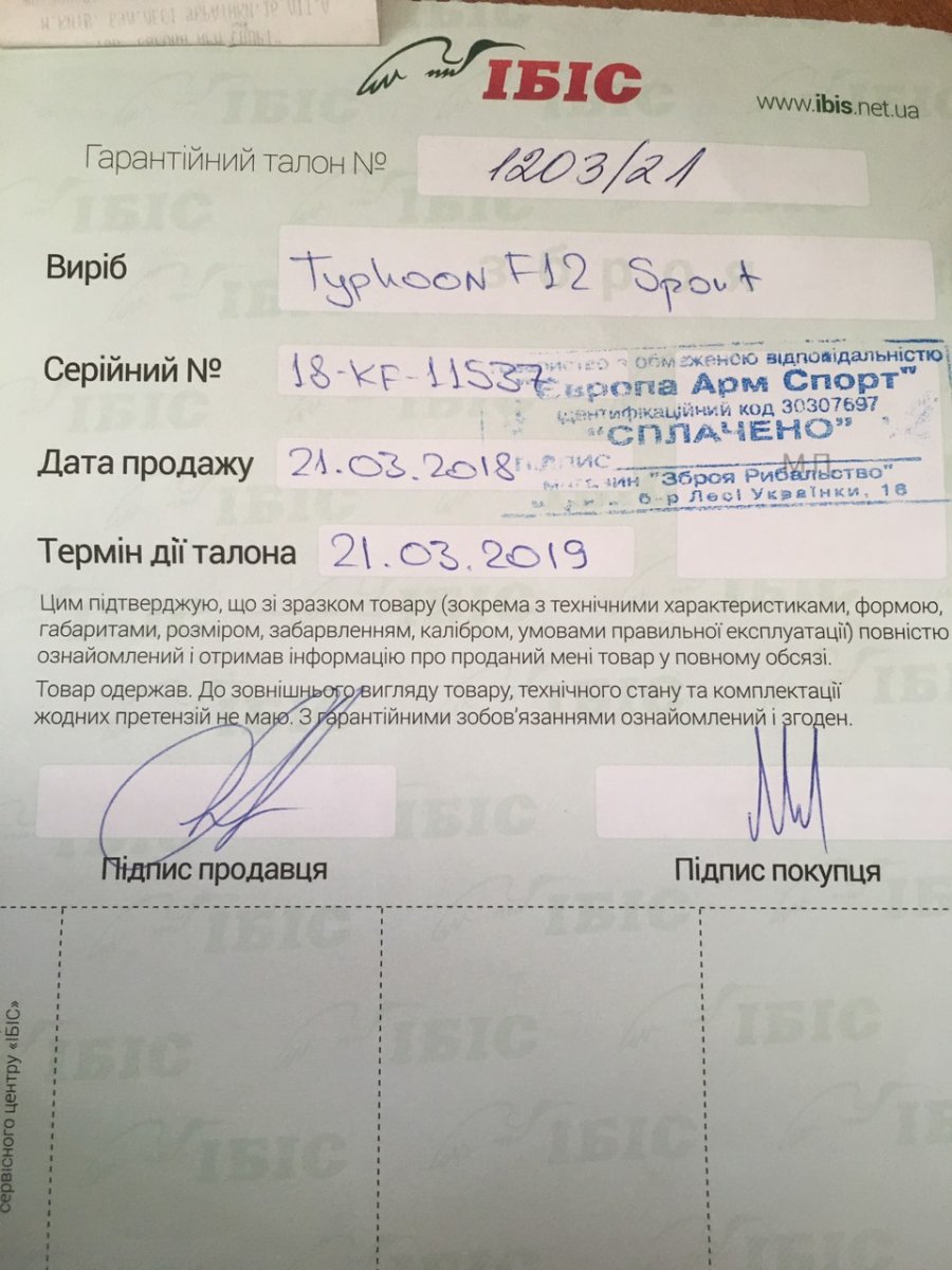 Продаю свой TYPHOON F12 Sport Цвет: Олива Полный комплект (заводской) + - Расширитель шахты магазина - Колиматор (крепкий китайский но с небольшим дефектом) - Ручка переноса огня Настрел: 300-400 выстрелов. Покупался в марте 2018 в Ибисе. Гарантия до марта 2019. Состояние: как новый. Цена: 19300 грн Переоформление за счет покупателя. Продажа в соответствии с действующим законодательством. Причина продажи: переход на высокоточку и надо многаденег) Киев.