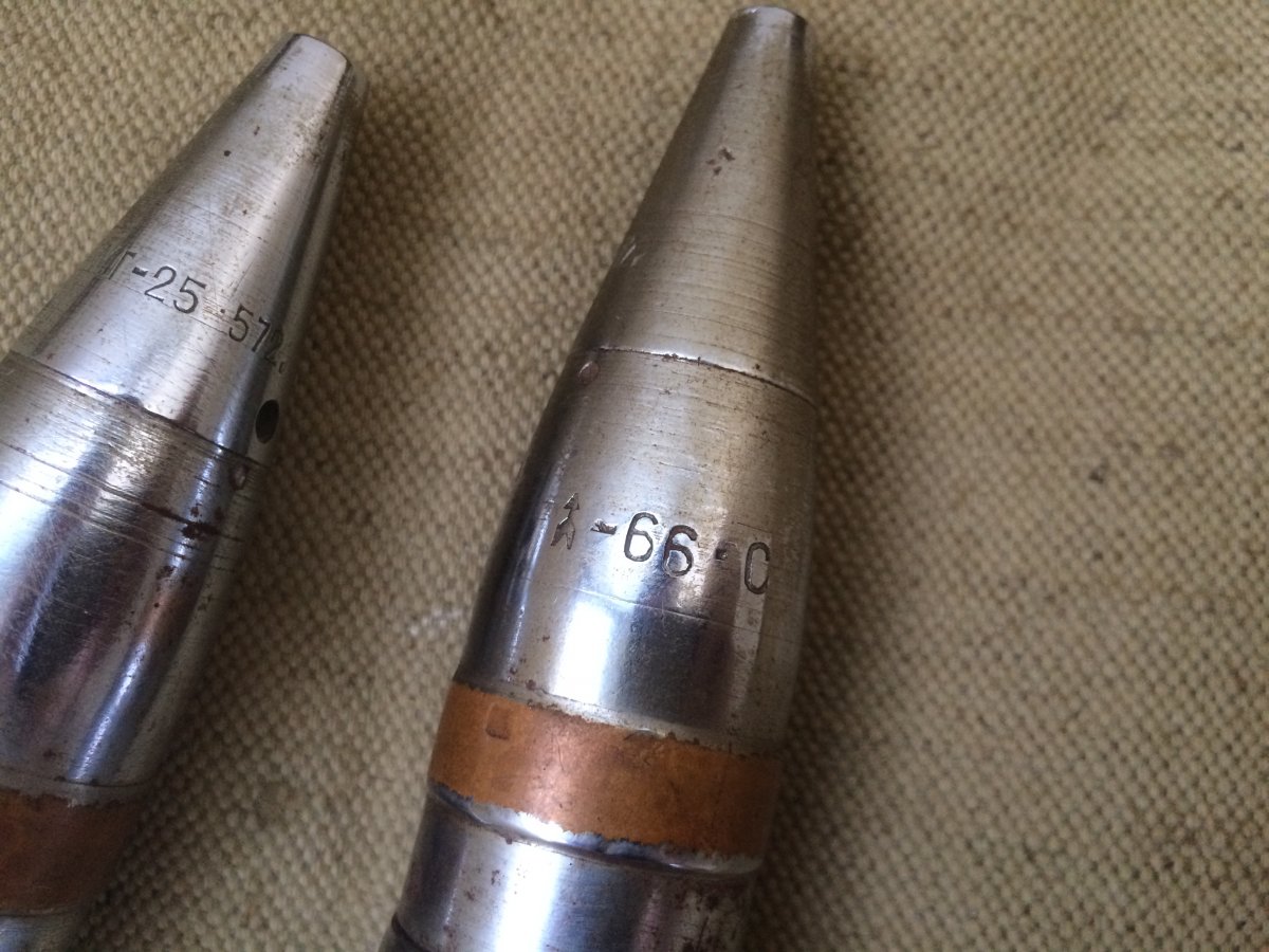 Здравствуйте, помогите с определением учебных снарядов. Что за зверь такой? Похож на 25 мм снаряд от автоматической корабельной пушки С-60, но не уверен. Может кому попадался. Маркировки: 184-О УЧ и 66г ОХ МГ-25-572