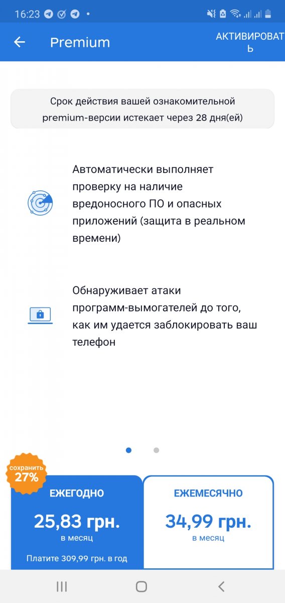 На самом деле, Malwarebytes не предоставляет бесплатную версию своего антивируса. При бесплатной загрузке вы получаете бесплатную 14-дневную пробную версию тарифа Premium ..... В качестве предположения... Не думаете, что подобные программы могут сами загружать на телефон немного дичи, чтобы потом отважно её найти и там самым мотивировать пользователя к покупке самой себя как мегаполезной??