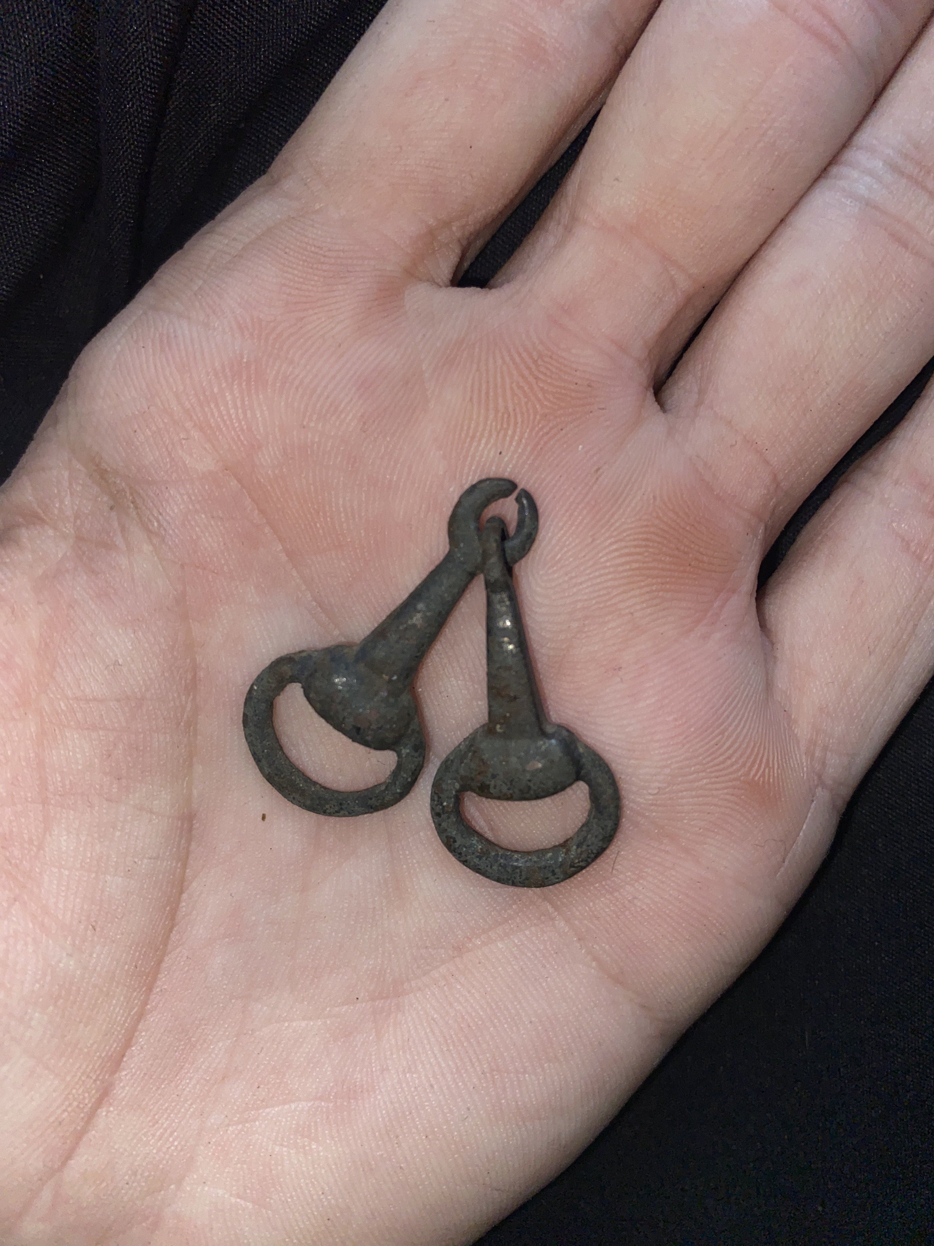 Здравствуйте, Удила двухсоставные с одним подвижным кольцом небольшого диаметра (около 4 см) на концах грызл(наплыв).Кольца эти служили для крепления ремней оголовья и повода и изготовлялись из железа или из бронзы. IV—VII вв. Финно-угорские племена Поочья и Верхнего Поволжья.с УВ!