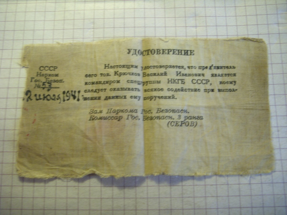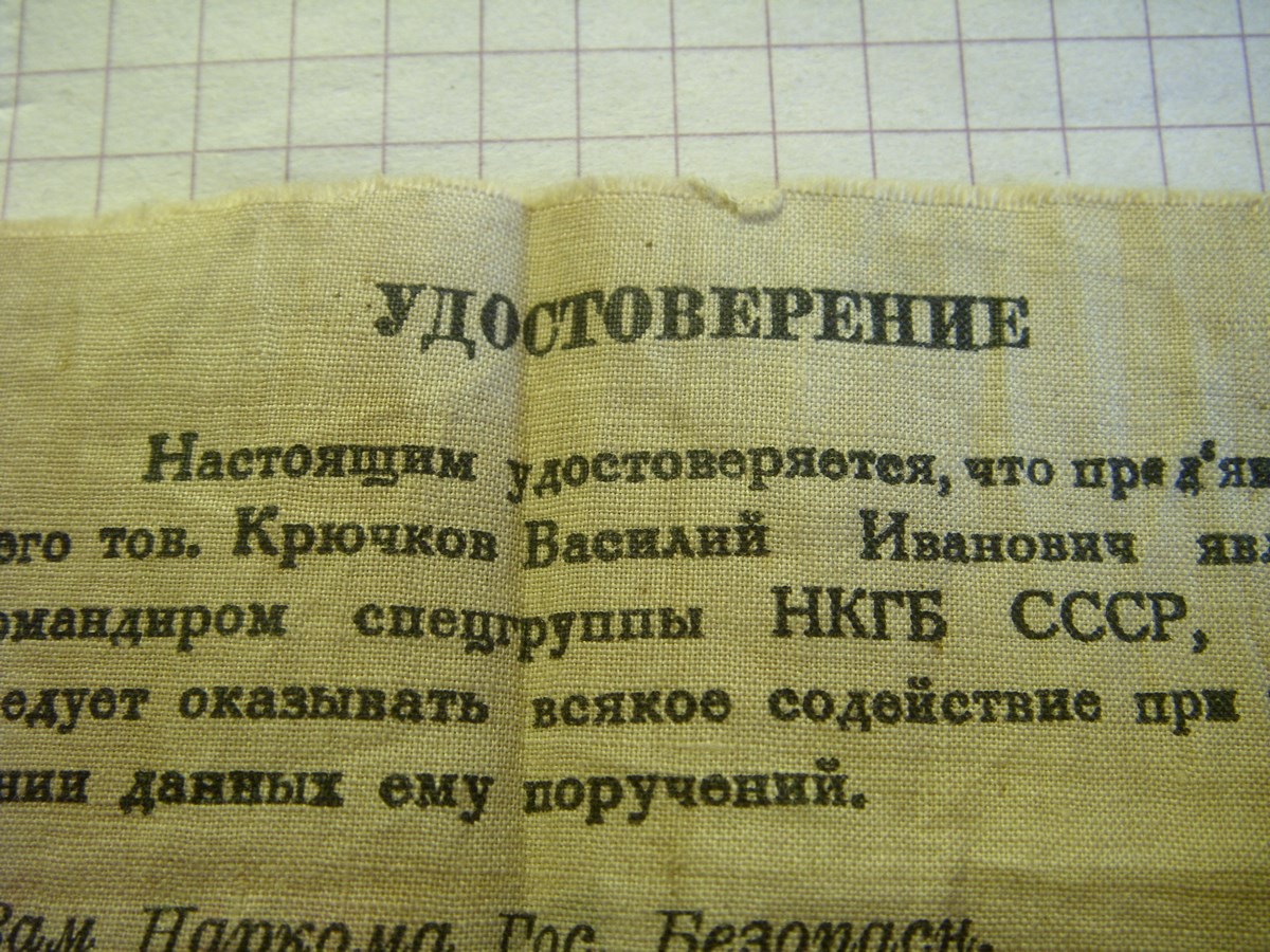 Начнём стого что такого рода документ должен быть заверен - личной подписью и судя потому что служебные корочки заверяли также и печатью, то должна быть печать - без вариантов. Нет не подписи не печати. Судя по трём в теме предоставленным примерам токого рода документов их заверяли личной подписью того кто выдал документ + печатью. То есть неисключено саблюдены некие правила делопроизводства. А на вашем документе как писал нет не подписи не печати. То есть даже для 1941 года это удостоверение уже филькина грамота, особенно при переходе линии фронта. Кто Серов и кто Крючков на 1941 год чтоб один смог послать на задание другого....??? И еще где в июле 1941 игода находился Серов, чтоб лично выдать удостоверение и где был Крючков...??? Смотрим на левый верхний угол вашего документа - как офрмлено и см. как оформляли похожие документы выложинные в теме, тоесть можно пробить место где документ выдан, а навашем просто некий Нарком Гос. Безоп. и некий номер с правлиной датой, а место выдачи неуказано. Дело в том что подделать сей так называемый "артефакт" в наше время не составит проблем - да и от куда вы знаете что шрифт старенький - проводили комплексную экспертизу ??? А заявление что это из семьи, это просто заявление не больше и не меньше, тут на форуме часто фуфло из семьи продать пытаются и что ?!!!..
