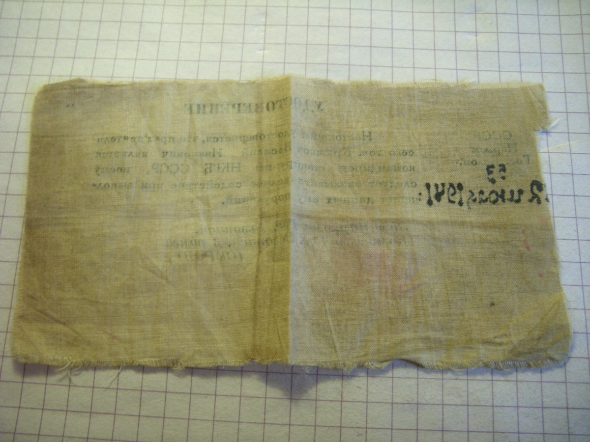 Фантазия. Как ФИО набрать, так типографским методом, а как число и дату, так пером. Чернила идентичны, дата стоит подправлена тем что оборвана первая цифра. Наносилось это творение уже на состаренную ткань. Где печать, где подпись? Место внизу оставили, наверное чтобы продлевать это удостоверение или вклеивать марки об уплате взносов.