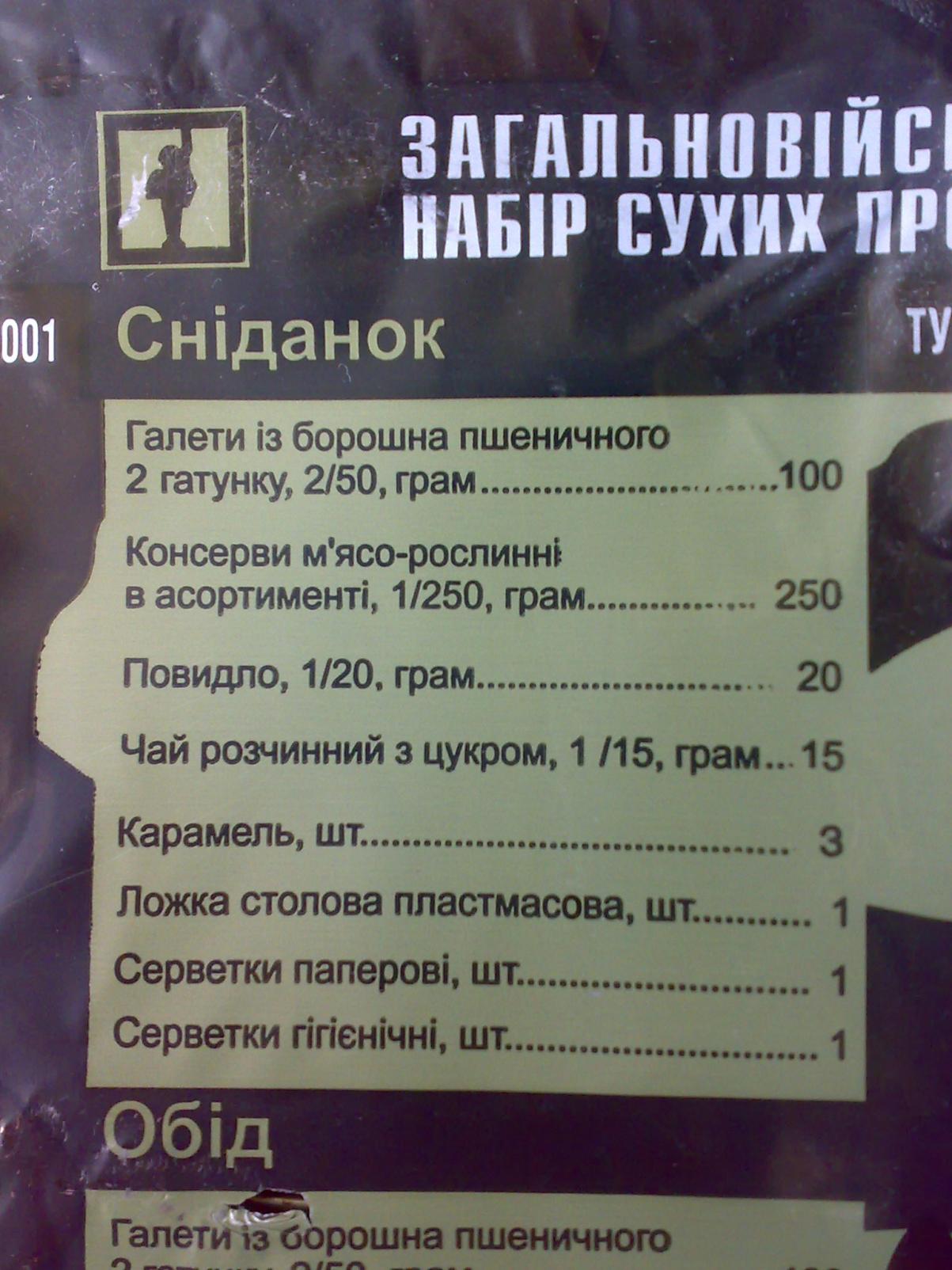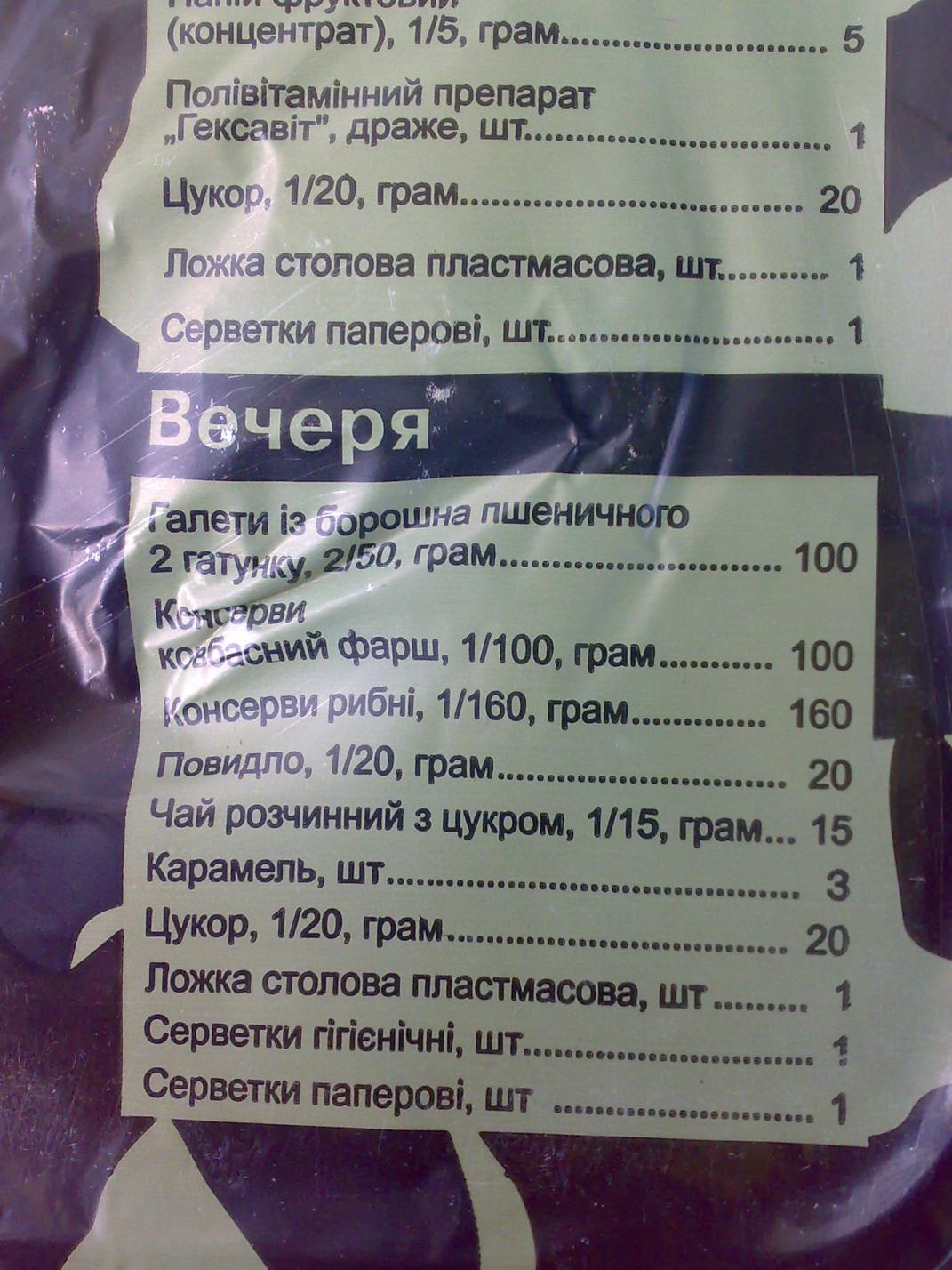 Приветствую всех форумчан! Решил всё таки обсудить эту тему здесь, т.к. уважаю без исключения всех форумчан и считаю их одной из выживших в наше время категорией людей, а не спившихся по барам и занимающимся воровством и разбоем. Сама притензия к товару - что это яд из просроченных продуктов. Итак: По этой ссылке закон об обеспечении армии сух. пайками: http://www.uapravo.net/data2008/base53/ukr53564/page7.htm как всегда много воды, но вот интересный параграф: "Загальновійськовим набором сухих продуктів забезпечується особовий склад у тих випадках, коли немає можливості готувати гарячу їжу з продуктів за основною нормою харчування; при цьому термін харчування не повинен перевищувати 3 діб." - НЕ БОЛЬШЕ 3 суток! - даже контора, которая выпускает эти сух. паи, сама говорит это. Вот ссылка на производителя российских сух. паёв: http://www.opkomplekt.ru/product/rpvn/irpb/ и обсуждение на рос/укр форуме: http://talks.guns.ru/forummessage/21/325276.html На форуме один пользователь очень ясно выразился: "Хороши, когда необходимо иметь готовый дежурный рацион питания. Т.е. "схватил и поскакал". Именно как аварийный комплект продуктов. В этом качестве - высший балл. В качестве продуктов питания в обычный поход - проще и значительно дешевле самому комплектоваться. Армейские рационы удобны и в том случае, когда необходимо двигаться в высоком темпе, экономя время на приготовлении пищи. В таком режиме рацион-Б более предпочителен, поскольку рацион-П - это просто суточная норма продуктов, которые можно съесть самостоятельно, без старшины и кухни. "отзывы разные... от хороших до плохих." Это потому, что не все разумно эти рационы используют. В качестве просто набора продуктов для пикника - это, естественно, дрянь. А вот когда нет времени или условий для нормального приготовления пищи - это очень даже очень! В любом случае, ЛЮБОЙ рацион предназначен для НЕНОРМАЛЬНОГО питания. Т.е. всему должно быть своё время и своё место, тогда и результат адекватен. И ещё, Продолжительность питания рационами - до 7 суток. Потом обязательно переход на нормальное питание! (3 раза, обязательно супчик и чаёк, овощи и мяско свежее)." Написано ясно как Божий день. А теперь сами подумайте, если 5-8 дней есть печенье и консервы - даже у обычного человека не случится ли запор, диарея и другие нарушения пищеварения? Организм человека нормально функционирует на пище, к которой его приучили с рождения - у нашего народа это борщ, суп, картошка, каши, фрукты, овощи и тд. Если барать сух. паи и питаться ими как основным рационом, скажем, весь поход (дней 5-8) - то проблемы с желудком вам обеспечены, а если использовать их как НЗ и "на всякий случай" - то всё будет нормально. Теперь давайте разберёмся с содержимым сух. пайка: - Галети із борошна пшеничного - обычные катлеты полуфабрикат, помещённые в вакуумную упаковку; - Консерви м`ясо-рослинні - обычные консервы, все знают, что срок годности у них большой; - Повидло - тоже все знают из чего состоит. сама по-себе сладкая субстанция, максимум засахарится; - Чай розчинний з цукром - всё ясно; - Карамель - ну типа цукерки ); - Бул`йон м`ясний (концентрат) - указано что это концентрат, а не свежеприготовленный, разница между ними, соответственно тоже есть; - Напій фруктовий (концентрат) - почти все напитки и соки, которые сейчас продают, делают из концентрата, так что организму не привыкать. Ну и остальная начинка вся в этом же духе - консервы и 