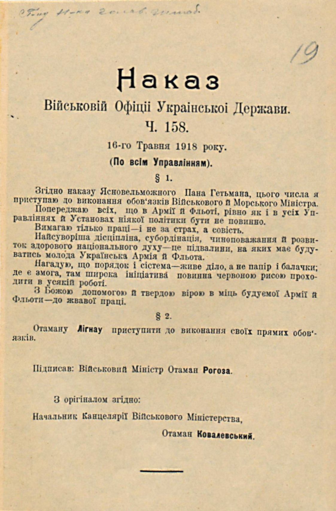 Наказ Військовій офіції Української Держави про вступ отамана Олександра Рогози на посаду Військового і Морського міністра. 16 травня 1918р.