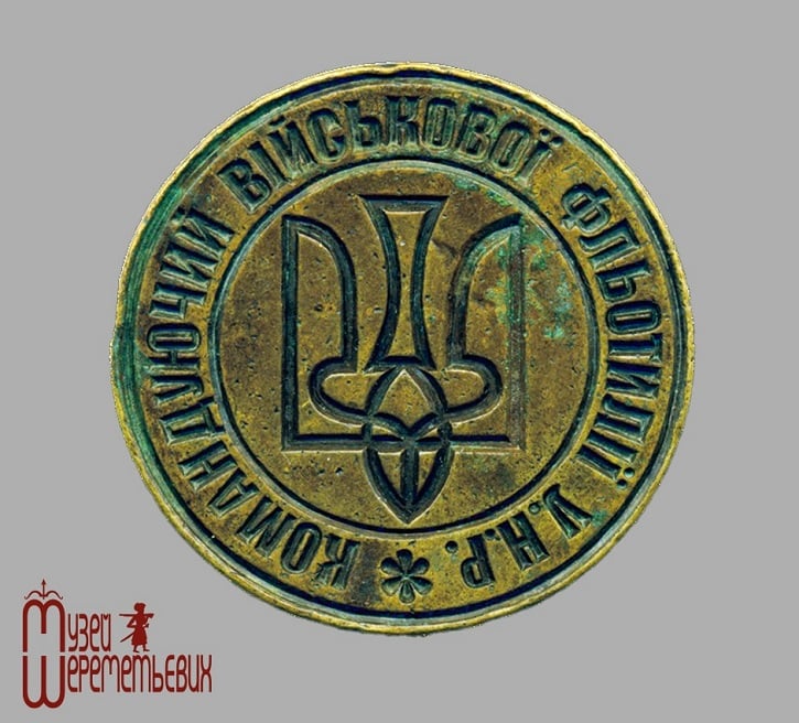 Печатка командувача Військової флотилії УНР, 1920р. Дзеркальне відображення. Метал; гравіювання. D – 3,4см; Н – 4,1см. Зі збірки Музею Шереметьєвих, Київ. Наказом Директорії УНР 17 квітня (за іншими даними, 14-го) 1920р. Симон Петлюра призначив контр-адмірала Михайла Остроградського головним начальником Чорноморського флоту та заступником військового міністра у справах військового та торговельного мореплавання. У травні Михайло Остроградський заново створює Дніпровську флотилію зі штабом у Києві. Представлена ж печатка – чи не єдине візуальне свідчення про цей маловідомий факт.
