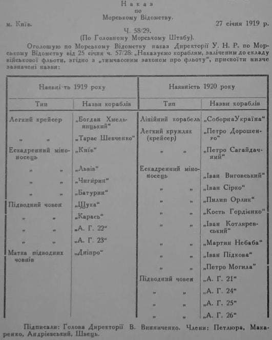 Наприкінці січня 1919 р. УНР ухвалила низку актів, що стосувалися флоту. Закон Української Народної Республіки, ухвалений 25 січня 1919 р., передбачав, що військовий флот УНР складатиметься з бойових та допоміжних кораблів усіх типів з береговою інфраструктурою. Визначався чисельний склад флоту: 12 500 матросів та 800 старшин, з яких 4500 матросів і 400 старшин мали бути призвані у 1919 р., решта – у наступному. Для підготовки кадрів у Миколаєві належало відкрити академію, гардемаринські класи, курси для старшин, спеціальні школи для матросів. Постачання військового флоту покладалося на Миколаївський і Маріупольський порти, ці порти також повинні були здійснювати поточний і капітальний ремонт кораблів. 26 січня 1919 р. Директорія УНР ухвалила спеціальний закон про поповнення армії та флоту УНР призовниками. Згодом був прийнятий ще один закон – "Про організацію військово-морських сил на узбережжі Чорного моря по лінії Очаків–Миколаїв–Херсон з доданням 75 верст до кожного боку трикутника". Вся ця територія передавалася в повне підпорядкування міністру морських справ Михайлу Білинському з наданням йому прав командувача окремого фронту. Планувалося сформувати там два корпуси та одну дивізію морської піхоти. На підставі Закону УНР про флот по Морському відомству 27 січня 1919 р. було видано наказ, за яким низці кораблів були надані почесні найменування. Ці правові акти залишилися нереалізованими. Уже в лютому 1919 р. українська влада і армія була змушена залишити Київ, а Південь України був зайнятий військами Антанти і Білими.