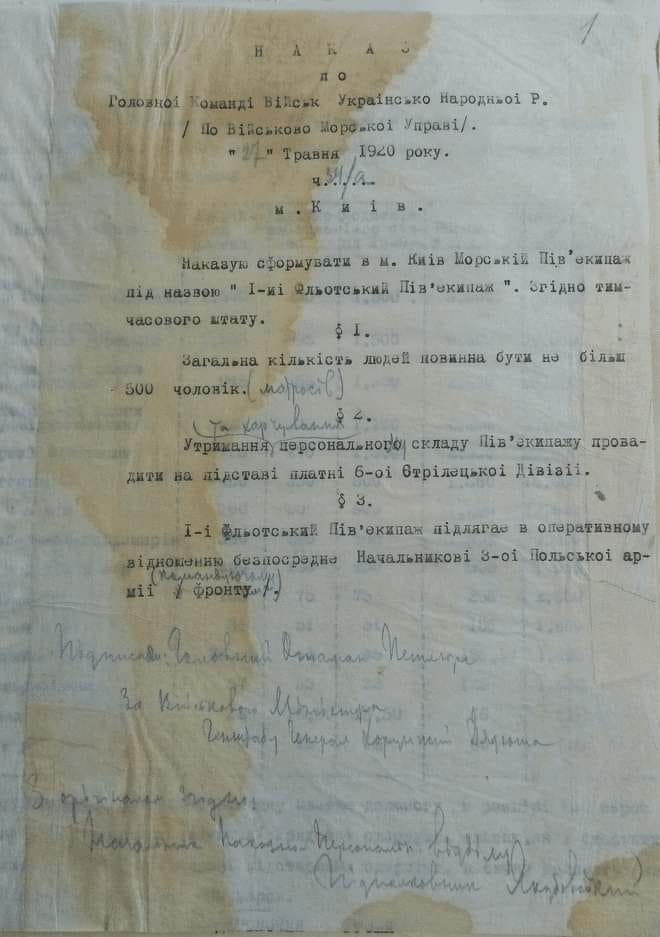 Наказ Головної команди військ УНР про формування у Києві 1-го Флотського півекіпажу. 27 травня 1920р.