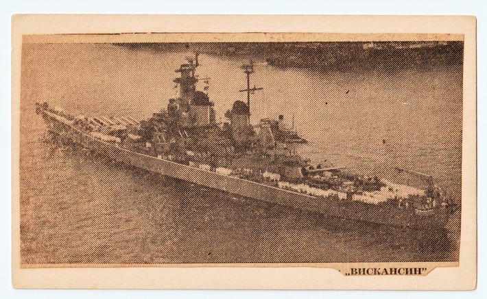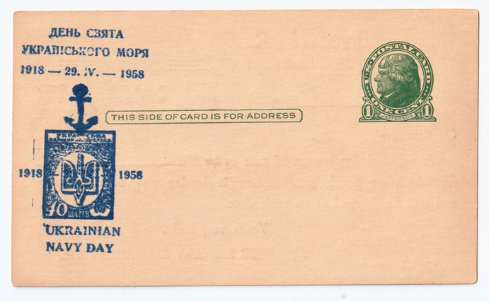 Ювілейна поштова картка, видана українською діаспорою в США у 1958 році до 40-річчя проголошення Чорноморського флоту флотом УНР 29 квітня 1918 року. У період радянської окупації України такі видання виконували роль «м’якої сили», підтримуючи тяглість державницьких традицій та нагадуючи світу про суб'єктність України. На аверсі розміщено репродукцію фотографії американського лінкора типу «Айова». Підпис кирилицею внизу праворуч — «ВИСКАНСИН» (USS Wisconsin, BB-64). Використання зображення американського суперлінкора на українській поштівці підкреслює союзницькі почуття діаспори до США та мрію про потужний український флот у майбутньому. Картка надрукована на стандартному цільному бланку пошти США (U.S. Postal Card) номіналом 1 цент із профілем Томаса Джефферсона (дизайн 1950-х років). На реверсі ювілейний напис: У верхньому лівому куті синьою фарбою надруковано: «ДЕНЬ СВЯТА УКРАЇНСЬКОГО МОРЯ 1918 — 29. IV. — 1958» «UKRAINIAN NAVY DAY». Зліва розміщено друковане зображення, що імітує першу українську морську марку 1918 року (номіналом 40 шагів), на якій зображено тризуб з якорем. По боках від неї дати — 1918 та 1958. Тиражі таких поштівок були обмеженими і розповсюджувалися переважно всередині українських громад у США (Нью-Йорк, Чикаго, Філадельфія). Ця картка — це не просто поштовий документ, а свідчення ідеологічної боротьби. Поєднуючи в собі американську поштову основу, зображення найпотужнішого на той час корабля США та українську державну символіку 1918 року, видавець створив візуальний міст між втраченою незалежністю та надією на її відновлення.