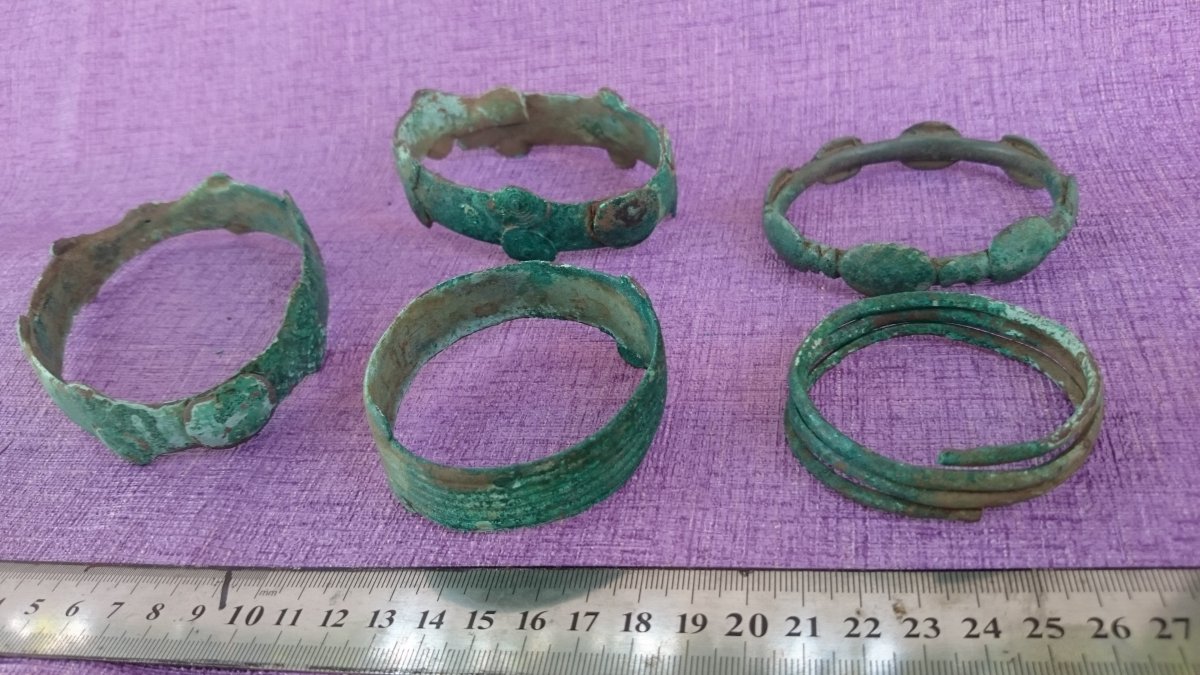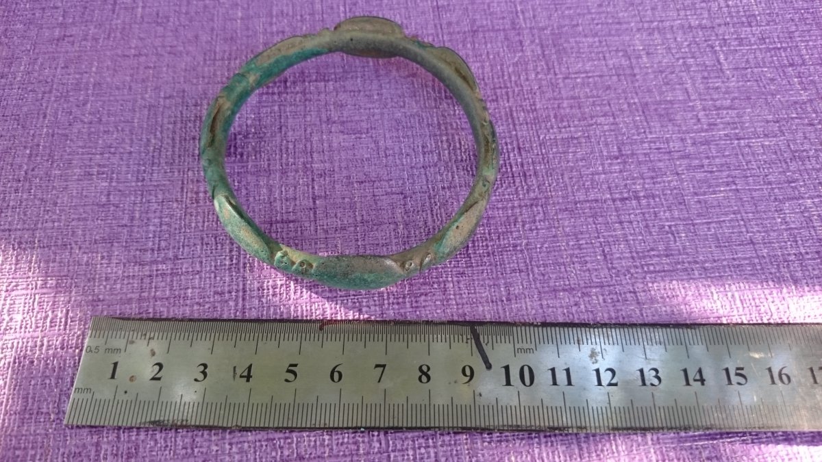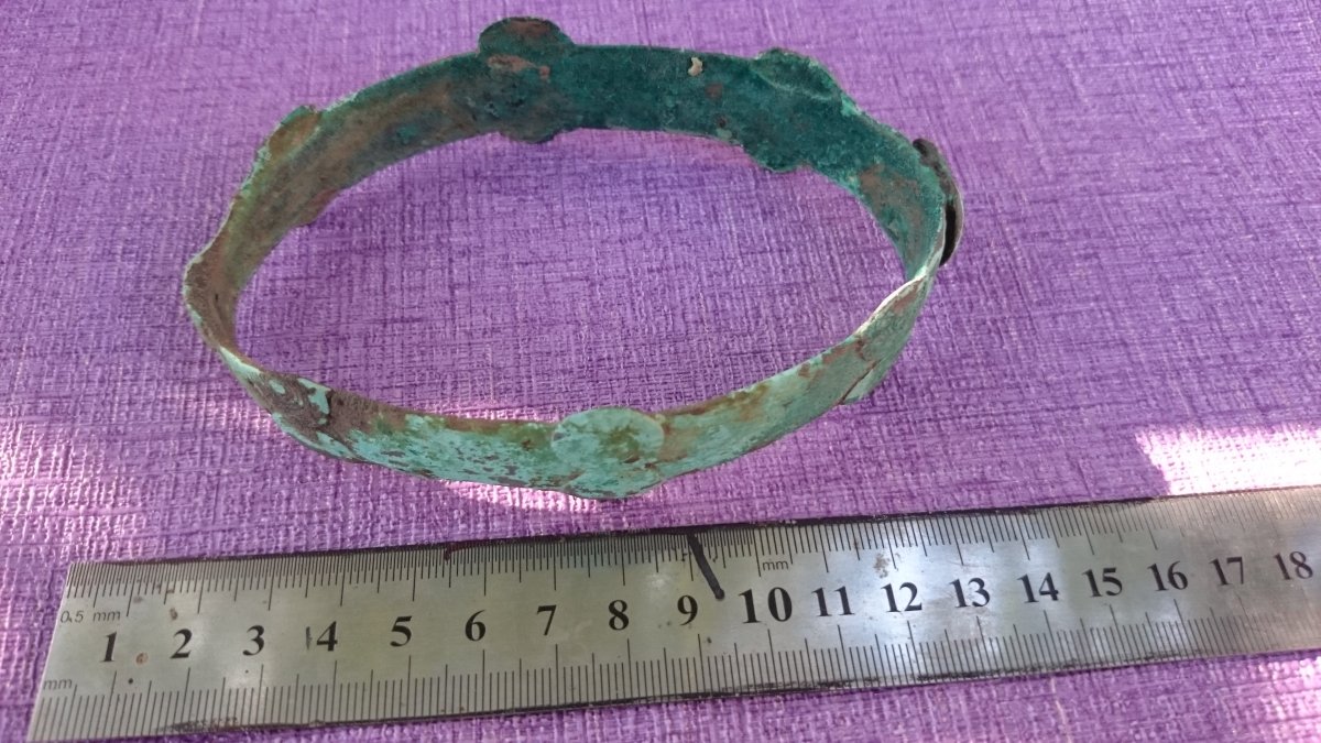 Здравствуйте.Подскажите пожалуйста по предметам,что это и какого периода,подняты все вместе с одной ямы,метал похож на бронзу или медь.За ранее благодарен.