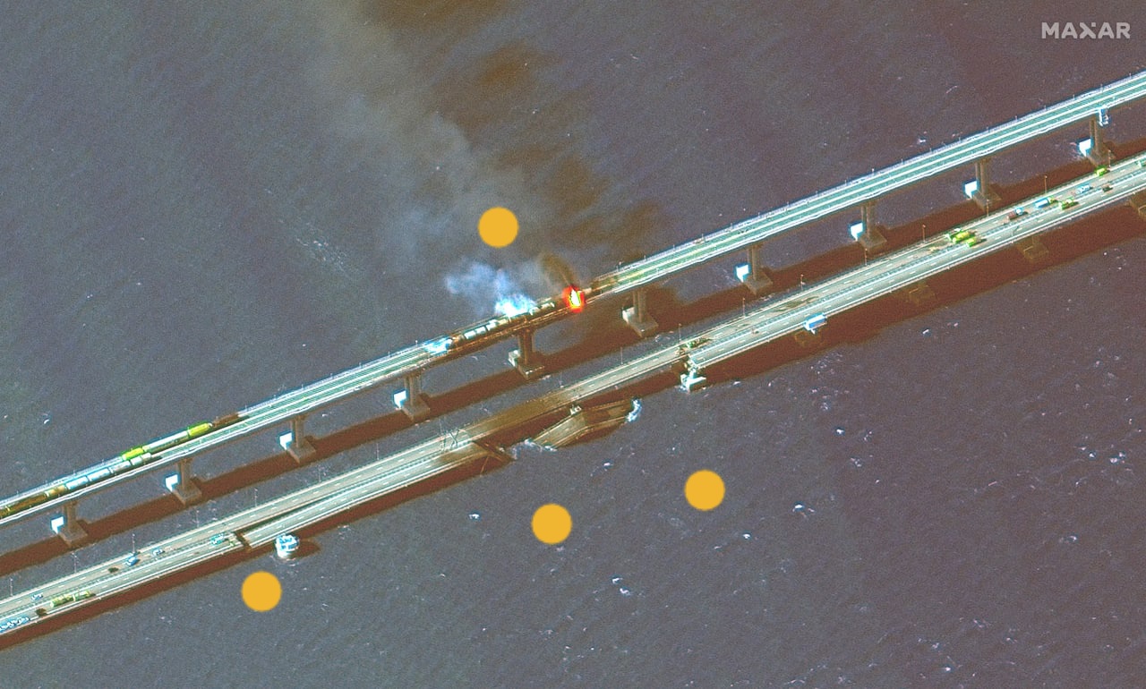 Вибух був там де видно пляму кіптяви на сусідній зустрічній полосі. Плиту підкинуло і переломало на опорі , заодно потягнуло з сусідніх опор. Вітром підпалило цистерни. Подивіться куди йде дим, туди і вітер, жд міст вищий і за вітром, полум'я від вибуху піднімало вверх, і зносило до жд моста, а там цистерни..