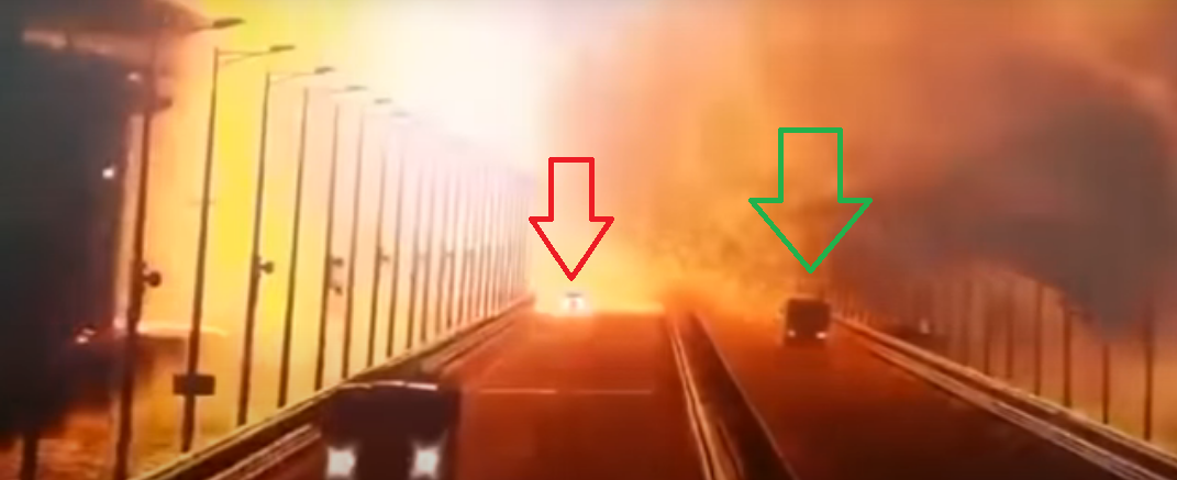Боріс - ще рАз - хто там і шо розбирав... ТАМ УДАРНОЇ ХВИЛІ НЕМАЄ !!! (передивІться відео) (21 тона, навіть - 7 тон мали би розчавИти оцей джип на папіросний папір - червона стрілка, а задню вантажівку знЕсти з пандуса - зелена стрілка)