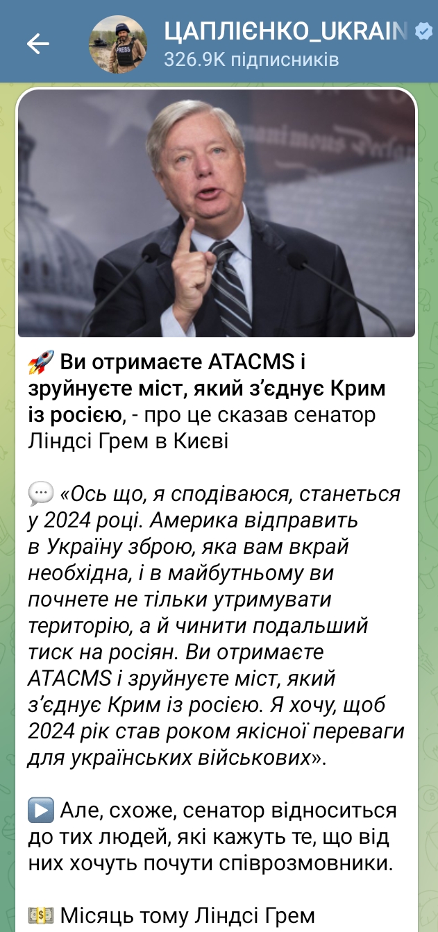 Ви отримаєте ATACMS і зруйнуєте міст, який з’єднує Крим із росією, - про це сказав сенатор Ліндсі Грем в Києві «Ось що, я сподіваюся, станеться у 2024 році. Америка відправить в Україну зброю, яка вам вкрай необхідна, і в майбутньому ви почнете не тільки утримувати територію, а й чинити подальший тиск на росіян. Ви отримаєте ATACMS і зруйнуєте міст, який з’єднує Крим із росією. Я хочу, щоб 2024 рік став роком якісної переваги для українських військових». ▶️ Але, схоже, сенатор відноситься до тих людей, які кажуть те, що від них хочуть почути співрозмовники. Місяць тому Ліндсі Грем проголосував проти сенатського проекту зовнішньої допомоги на $95 мільярдів. ❌ Через те, що Грем проголосував «проти», законопроєкт не досяг потрібної мети навіть із підтримкою 22 голосів Республіканської партії. ↔️ Слова поки що розходяться з ділами. (с) На мериканців у цьому питанні схоже надії немає, тож прийдеться Борі маскувати москведро аід айсберг, поки літо не настало))))