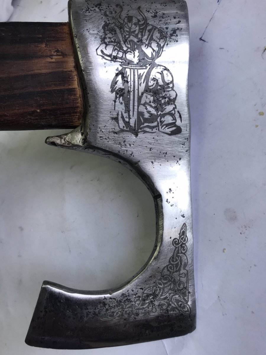 Привет.Цены-индивидуальные на каждое изделие.Можно и на товаре под заказ,можно и на своих изделиях (кружки и некоторые Ножи,например,гравёры сами закупают).За топор уплочено 300,за тигра на ноже-200.