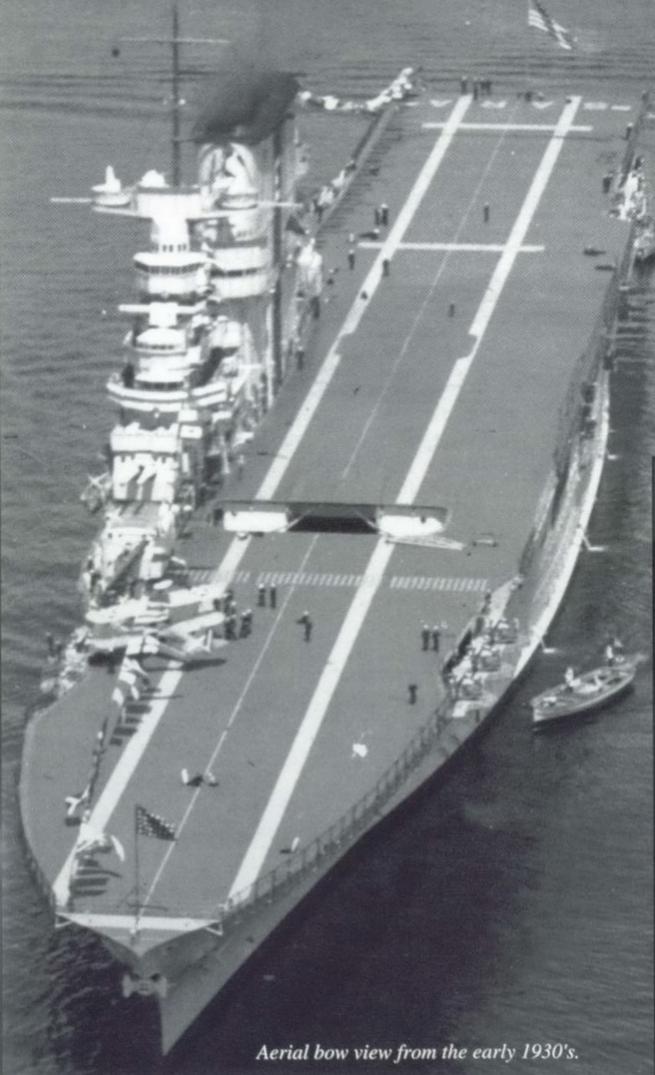 В том же Warship pictorial есть фото "Лексингтона" сверху, датированное 15 марта 1932 года. На нем в переднем лифте виден самолет, похоже, биплан, со сложенными крыльями. Самолет при этом стоит почти перпендикулярно оси судна (на глаз - градусов под 70). Теперь вопрос: не мог ли искомый самолет подниматься на палубу аналогичным способом? "Саратога" и "Лексингтон" однотипны. Если лифт (основная площадка) имеет размеры 13,7х7,6, то диагональ - минимум 15,5 м. Учитывая, что TG-2 имеет размеры 16,15х10,85 м, то со сложенными крыльями этого хватало со свистом. И еще - в этом же источнике (стр. 12) есть фото трубы "Лексингтона" с буквой Е. На "Саратоге" на всех фотках Е нарисовано на фоне вертикальной полосы. Здесь ее нет.