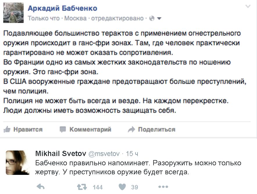 Поток "аналитических" постов в фейсбуке от туповатой вышиваты зашкаливает. С украинских проблем все тут же переключились на поиск "путинского" следа в парижских терактах. Выходит не очень, но кто же может сомневаться в теориях вышиваты - в Украине это не патриотично. Вот пока одно из немногих адекватных мнений по событиям в Париже: Alexander J Flint 10 мин · Нью-Йорк · отредактировано · Кровавая Пятница 13 и опять как и в 1307 году в Париже... Значит судя по почерку это либо Аль Кейда, либо научившийся у неё ИГИЛ. Высокая координация, серия небольших, но кровавых тер актов, нахождение "мягких" мишеней, хорошая подготовка - чисто аль кейдовский почерк. с другой стороны имея войну в Сирии последние 4 года, можно уверенно сказать, что людей хорошо обученных и готовых умереть за эту их религию, полным полно и ИГИЛ лишь перенял методы Аль Кейды, а людей поставил своих. Из Франции на войну в Сирии отправилось почти ~2000 молодых людей. Добровольцами. Так что недостатка в обученных людях нет. Из Америки туда же поехало 250 человек. И, как считают, самое большое количество добровольцев из России - почти 10.000 человек. И в момент когда они вернутся - начинаются проблемы. Плюс беженцы, которые хлынули как поток и кто и что они никто не знает. А Европа даже проверять не хочет да и не может. Потому моя версия такая и я полностью отметаю Путина, (он мелкий интриган, хулиган и бандит, а тут - это формальное объявление войны. если найдут серьёзный русский след, то это нападение на члена НАТО, а Путин далеко не идиот). Местные французы-арабы поехали в Сирию. Верой и правдой убивали за Аллаха. В это время их родная Франция начала их же бомбить. И вот эти люди едут обратно в свои парижы и устраивают полный аллах акбар на улице и в концертном зале. И что мы знаем: У террористов во Франции есть организация. У них есть оружие или возможность его переправить - границ нет и их никто не охраняет. Опять таки Европа это неготовая ни к чему и никак территория ленивых и зажиревших людей и потому уже я читаю трусливые реакции, которые винят самих себя - типа зачем мы влезли в Сирию. Сирия и её война начали выплёскиваться наружу. Наш дальнейший ход? Так для справки - мы на пороге большой региональной войны, когда взорвётся весь регион. Поток никем и никак неконтролируемых беженцев, среди которых могут быть террористы сейчас или услугами европейской соц помощи они будут выращены в будущем, нужно закрывать. ВООБЩЕ. Лучше дать много денег Турции и обустроить их там. Турки не будут церемониться. Нужен новый президент в США. Плевать из какой партии - главное более решительный и менее наивный, чем Обама. Нужно прийти к пониманию, что Ислам нереформируем и должен быть в том виде как он есть сейчас объявлен человеконенавистнической идеологией. И бороться с ним как когда то с коммунизмом. Когда он поменяется - тогда поменяемся и мы. End.