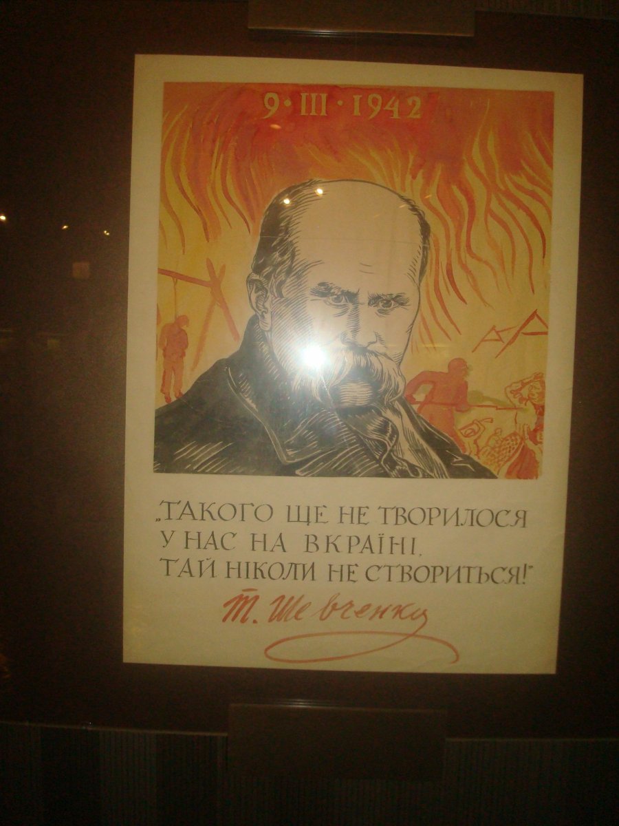 Этот плакат висит в музее, в Киеве. Задал вопрос сотрудникам по сути написания... В ответ - невразумительное мычание.. Специально сохранил на телефон, но, как-то, повода не представлялось. Откуда вырваны строки Тараса Григорьевича и когда написаны, не знаю.. Потому и спросил.. А Вы, мне, вопросом на вопрос...