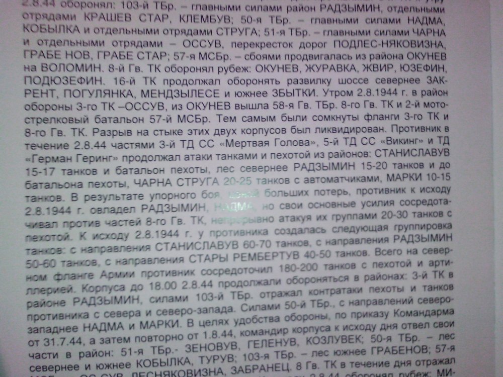 И вы сразу ему поверили.А если бы он сказал,что лично видел как в бою с его дивизией был уничтожен советский стрелковый полк, вы бы даже не обратили внимание на очевидное вранье битого генерала. В смысле большие??? - Небольсин дает потери в танках Немецев по немецким же источникам, я тоже приводил не наши сводки, а Камена Невенкина. Теперб по 3 т.д.СС - хорошо давайте по другому - на карте на ст.49 в книге ROBERT FORCZYK "WARSAW 1944" (издательство Оспрей) указано, что 3 т.д.СС с 31 июля 44 года атаковала восточный фланг 8 гв.тк, плюс на карте боя 2 ТА в книге Небольсина тоже указаны направления атак и численность атакующих танков 3 т.д.СС на восточный фланг 8 гв.тк - так как??? В немецкой официальной истории 3 тд принципиально исключена из частей участвовавших в боях со 2 ТА 1-4 августа.Гланц также не учитывает её. http://en.wikipedia.org/wiki/Battle_of_Radzymin_(1944) 73rd Infantry Division (facing Soviet 16th Tank Corps) 19th Panzer Division (facing Soviet 3rd Tank and 8th Guards Tank Corps) Hermann Göring Panzer Division (facing Soviet 3rd Tank Corps) 4th Panzer Division (facing Soviet 3rd Tank Corps) 5th SS Panzer Division (facing Soviet 3rd Tank and 125th Rifle Corps) Хотя польский источник утверждает,что 3 тд атаковала советский танковый корпус http://wap.imf.forum24.ru/?1-15-0-00000018-000-40-0 тгдСС Т также как Викинг получила приказ на выделение БГ для удара против 3 тк. 1 августа эта боевая группа (два батальона 5грпСС поддержанная танками) нанесла удар в направлении Воломин и к 3 августа достигала успеха , отрезав пути отхода для 3 тк. Дивизия к концу 5 августа полностью сосредоточилась против окуневского выступа, но уже с 6 августа была вынуждена перейти к обороне и прикрывать бреши на стыке 9 и 2 армий. 1 августа в тгдСС Т Pz.IV 10/15=25, Pz.V 22/35=57, Pz.VI 1/8=9, StuG 12/42=54, всего исправных 45 ед.БТТ к 6 августа в боях против 2ТА принимали участие Пантеры 1/3тпСС Pz.IV 2/3тпСС и Штуги. Безвозвратно было потеряно 5 Пантер и 3 Штуга, выведено из строя не менее 6 Пантер, 10 Pz.IV и 8 Штугов. Общие потери дивизии составили не менее 32 ед.БТТ.