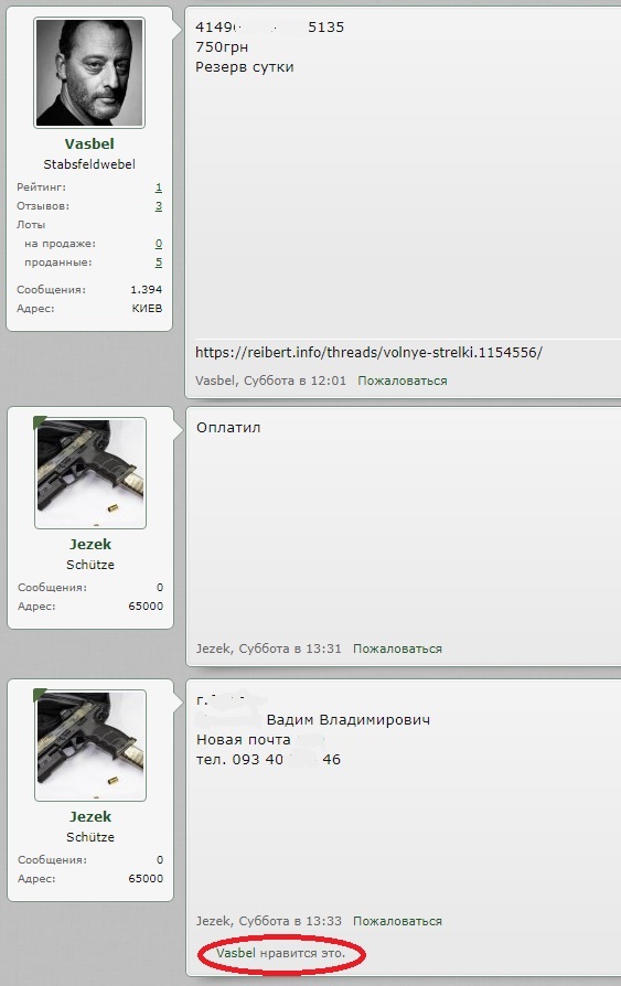 Здравствуйте уважаемые.Я с Васей встречался 1 раз в Киеве.Перед этим заказывал у него 50 шт. на пробу.Товар высочайшего класса,вот сейчас опять понадобились а тут такое.Где теперь брать ума не приложу.Специально ездил к нему проконсультироваться по поводу своего недавно приобретенного Вия.Какой травмат я купил (хороший или так себе) какие патроны лучше брать к нему,какую максимальную нагрузку он может выдержать и т.д.Вася мне все профессионально рассказал (как доктор) не взяв ни копейки за рекомендации,хоть я предлагал.Это физически здоровый,грамотный,законопослушный и воспитанный человек никак не похож на мошенника.Вероятнее всего случилось что-то,не мог он кинуть человека позарившись на каких-то 750 грн.,ну не верю я в это хоть убейте.Человек тренирует людей как правильно пользоваться оружием (при мне звонил в тир договаривался о времени).Телефон у него отключен,думаю не хорошее что-то случилось.Подождать нужно может все выяснеться.Извините если что не так,просто высказал свое мнение.С.ув.