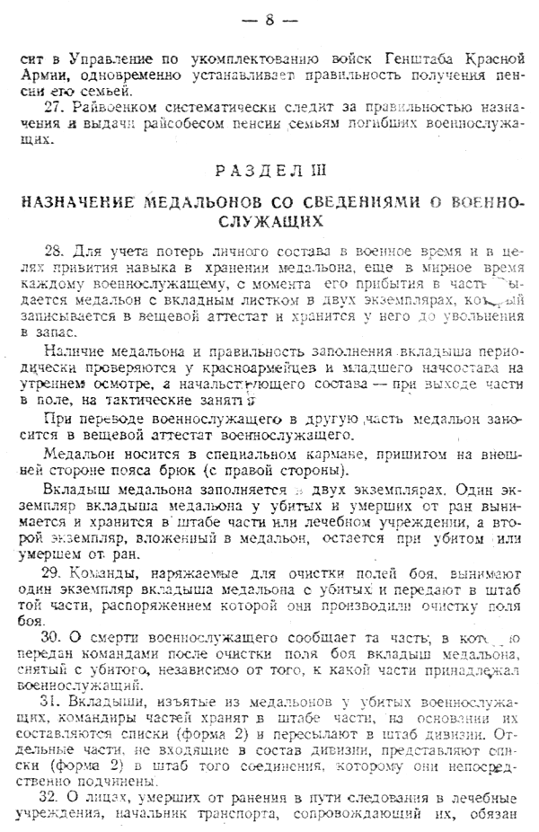 Так ладанки образца 1925 года попадаются и по ВОВ. Соседняя тема камрада Sweger https://reibert.info/threads/fljaga-bojca-rkka-podpisnaja.1007452/ Эбонитовый или бакелитовый пенал с двумя вкладышами был введен "Положением о персональном учете потерь и погребений личного состава Красной Армии", объявленным приказом НКО № 138 от 15 марта 1941 г. http://soldat.ru/files/4/6/15/294/ Был еще приказ НКО СССР № 238 от 21 декабря 1939 г. С объявлением "Инструкции о порядке пользования медальонами с краткими сведениями о военнослужащих Красной Армии" и "Положения о персональном учете потерь личного состава Красной Армии в военное время", отмененный приказом № 138, но его я пока не нашел. Пенал отменен и исключен из табелей снабжения приказом НКО № 376 от 17.11.1942г. Я к тому, что в приказе № 138 не указано, кто должен заполнять ЛОЗ. Поэтому многие командиры могли руководствоваться прежними. Здесь выложены приказы по учету потерь военного времени (1941-45 гг) http://forum.unm.org.ua/viewtopic.php?f=30&t=912&sid=4051bf8305900915cf3e71750e57e928 С уважением,
